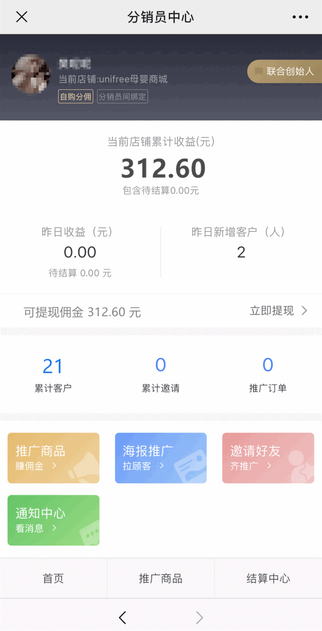 点击进入“分销员中心”查看自己的佣金金额,可直接提现到您的微信钱包里。大家也可以看到自己累计的客户哦~