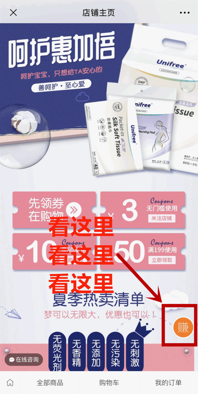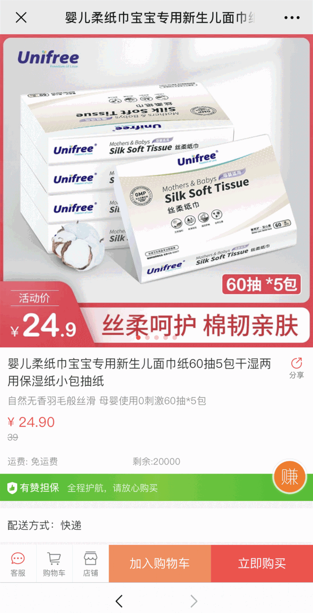 扫描程序码进入Unifree母婴商城,可以看到有个“赚”的字样,表明身份审核已通过,大家就可以分享产品到朋友圈啦。