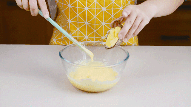 取1/3蛋白糊加入到芝士糊中,搅拌均匀,加入剩余的蛋白,翻拌均匀