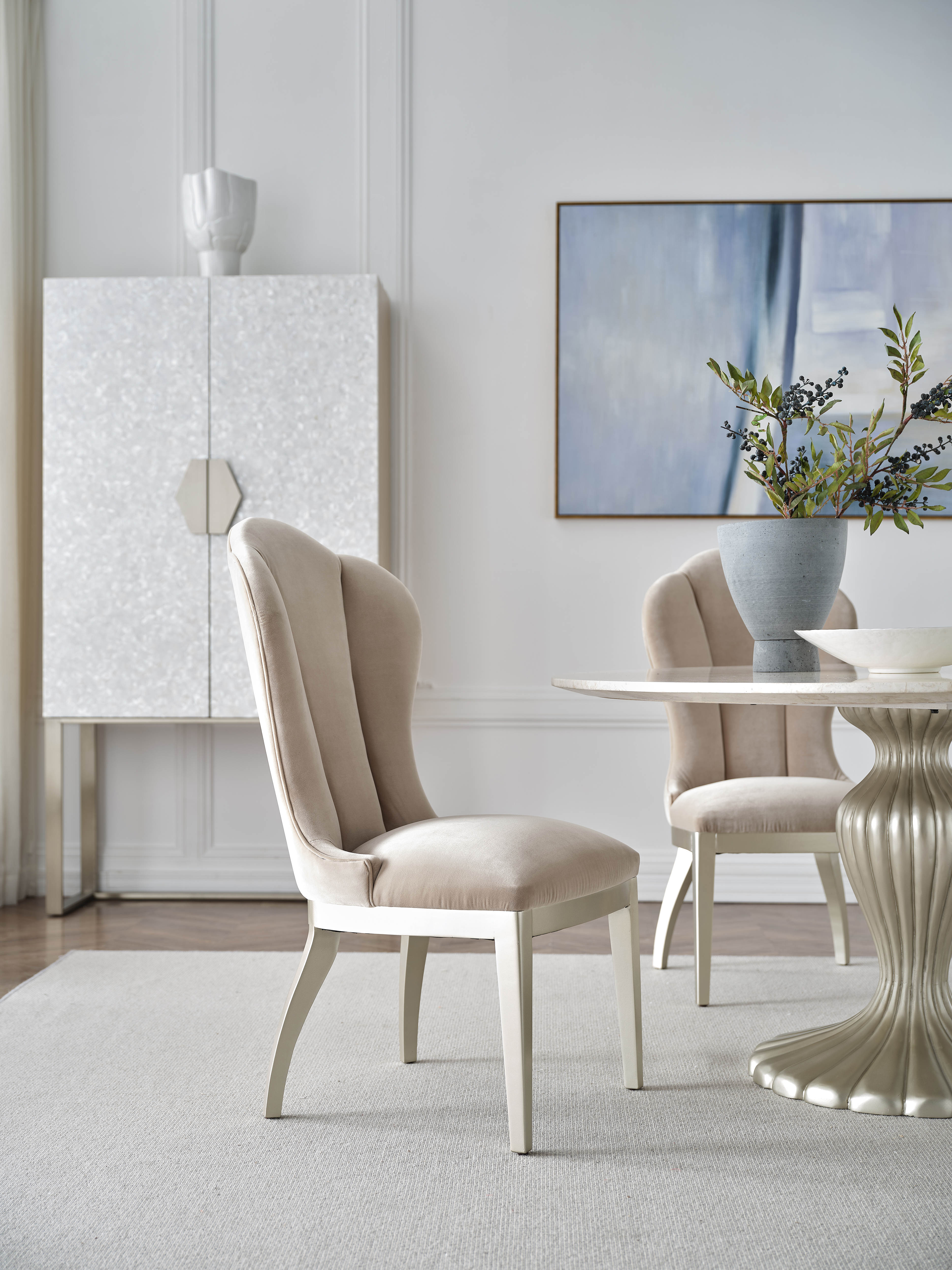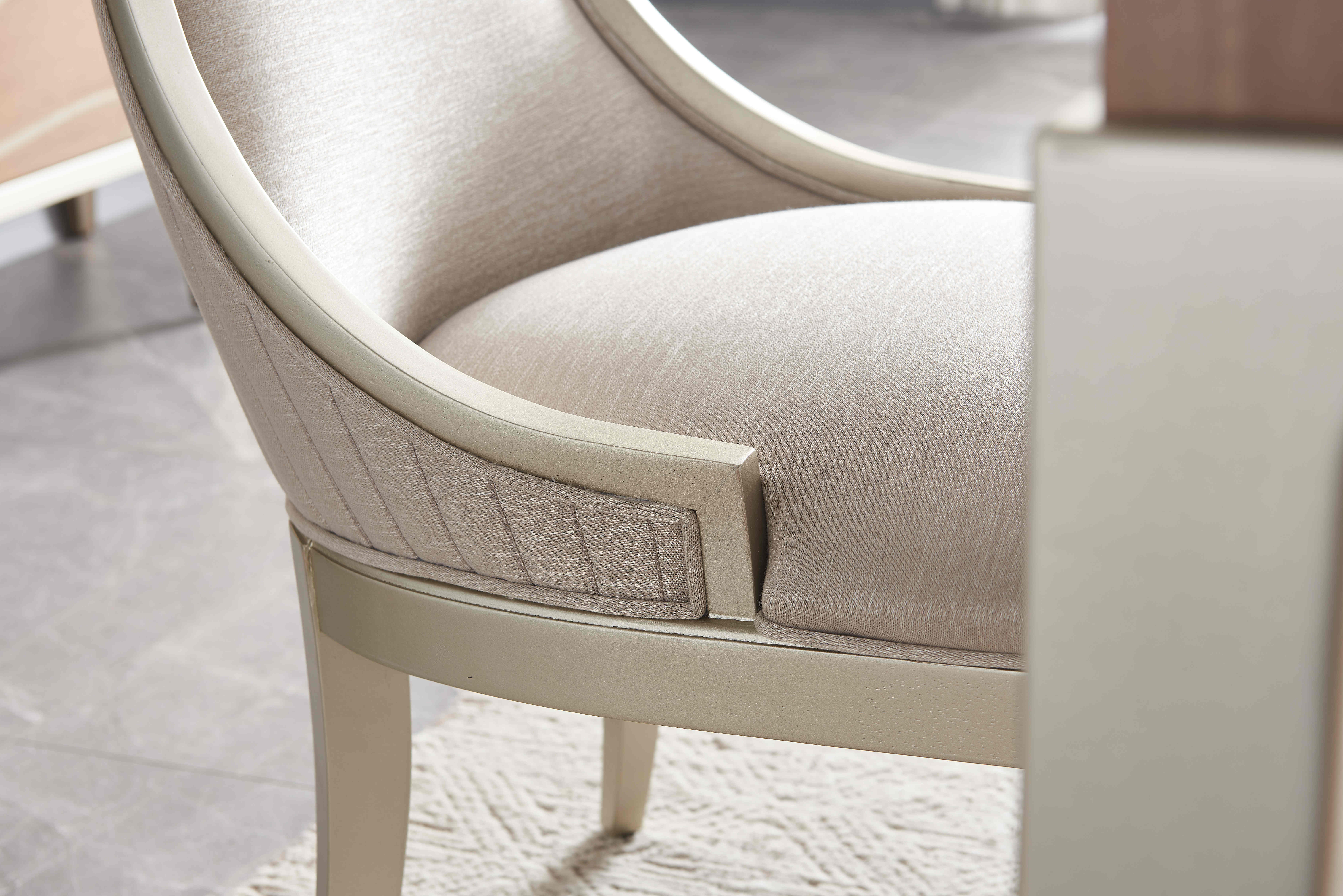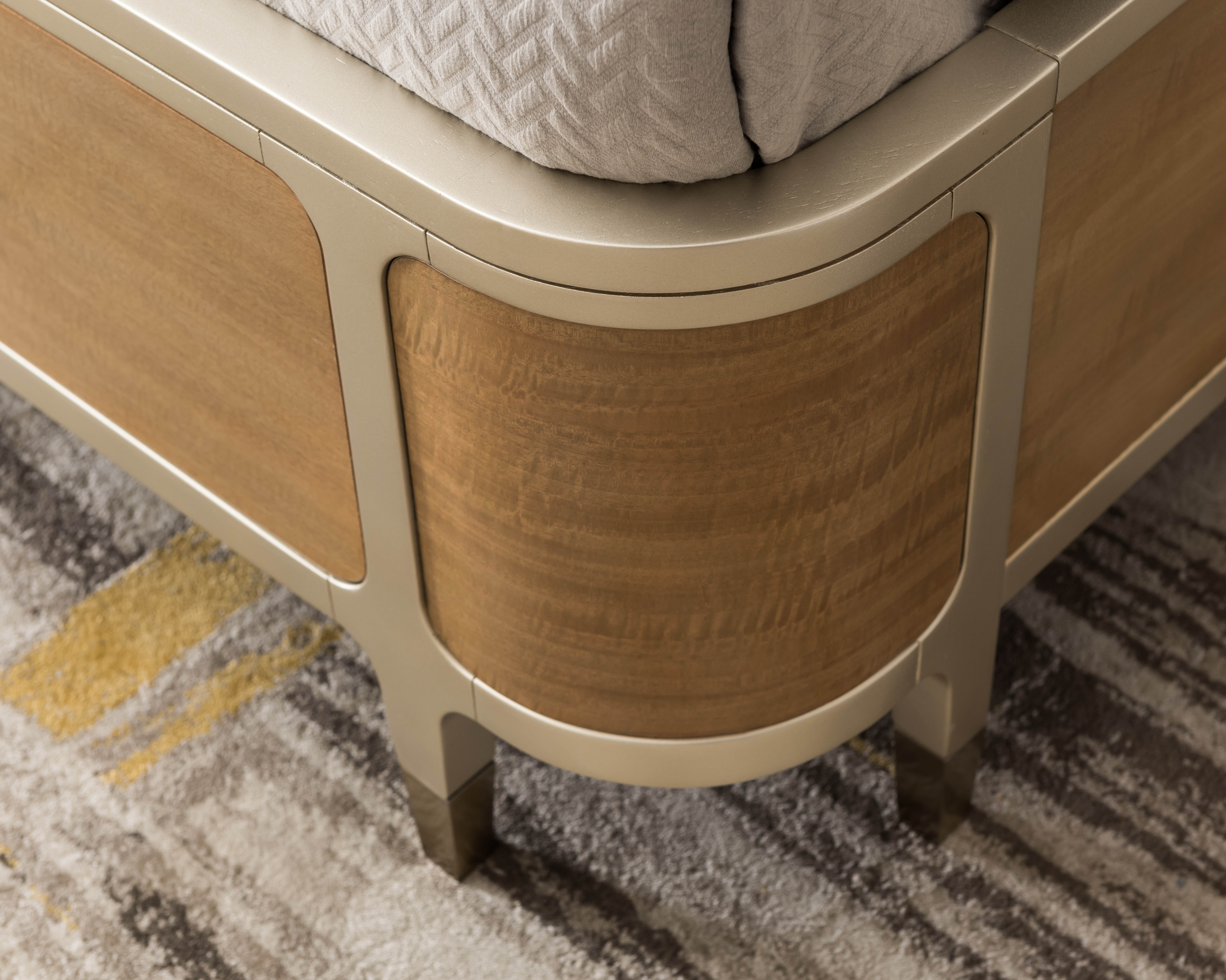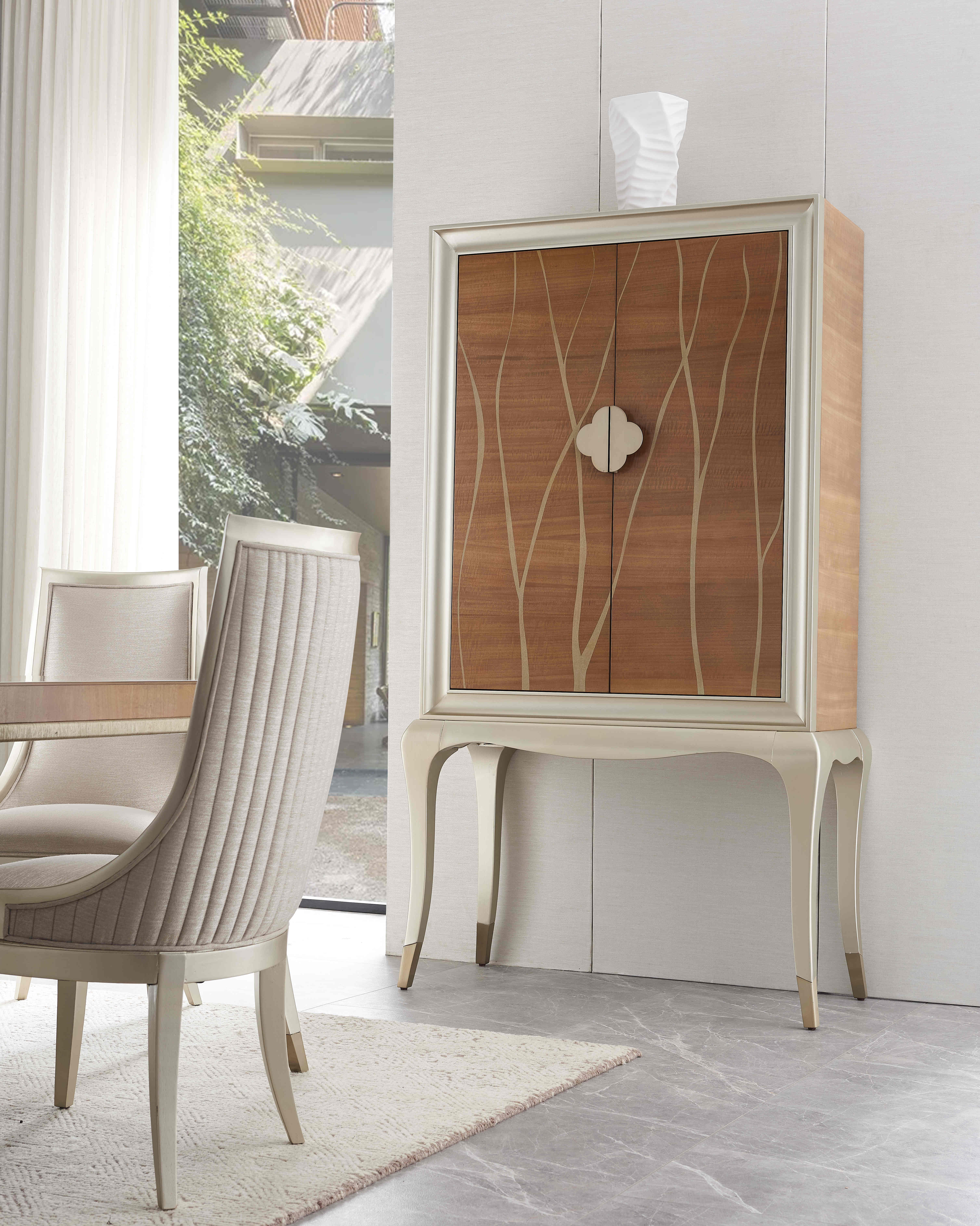 在造型上,Versailles系列延续凡尔赛宫廷建筑的形式,设计师运用大量曲线设计,多层线条勾勒出立体视觉感,采用琥珀金色的金属木器漆,让整体氛围都更加优雅精致。蜿蜒的法式线条简洁利落,没有冗杂的装饰,在现代都市轻奢的空间中,把法式宫廷的浪漫揉进每个角落。
