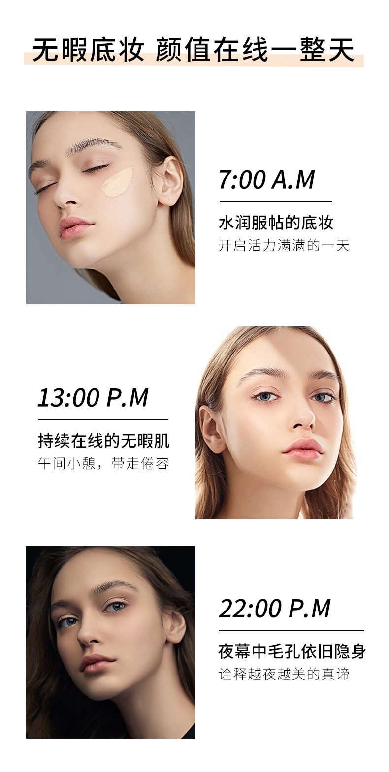 粉底液:夏季比较适合轻薄的底妆效果,粉底液水分含量较高,可以打造和肌肤水油平衡的感觉,并且效果好适合自己的粉底液,夜晚即使出油也会越夜越美丽。