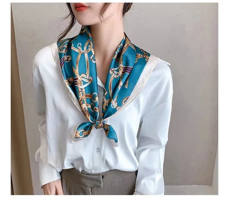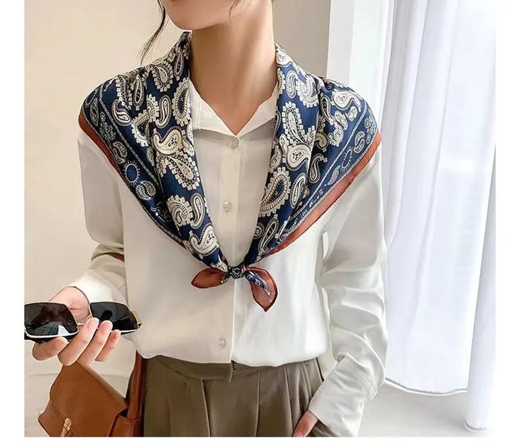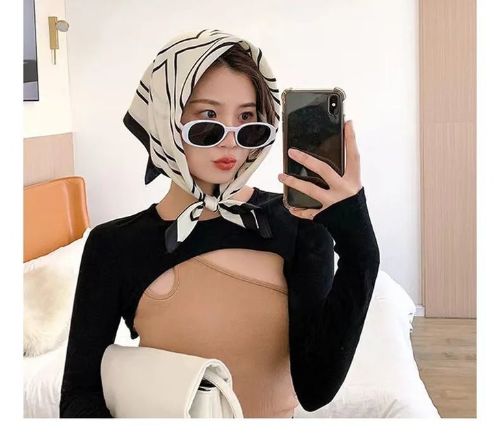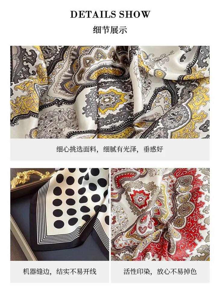 这款丝巾采用的是仿真丝面料,丝滑得如同人的皮肤,细腻有光泽,垂感好。轻盈又亲肤,在自然光线下,泛起动人的波澜。