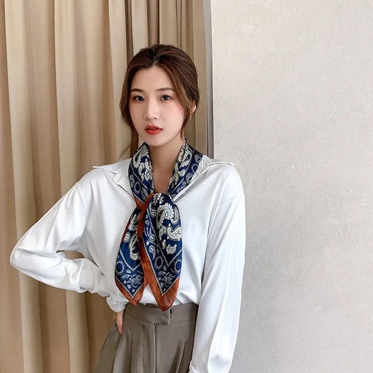 这种用小方巾在脖子对称打个结,简单随意有点可爱,不挑丝巾的图案,容易为造型增添亮点。