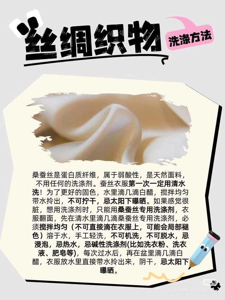 特别注意:桑蚕丝不耐碱性洗涤剂,避免使用洗衣粉或肥皂。