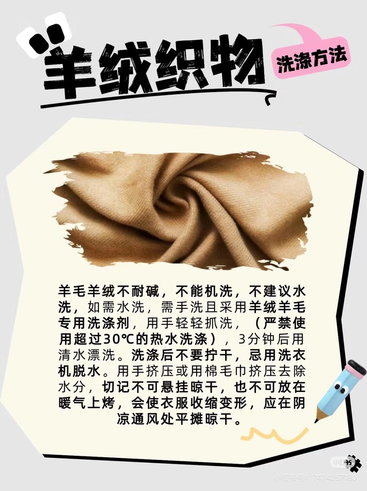 适用洗涤剂:使用丝毛类洗涤剂,避免酸性洗涤剂。
