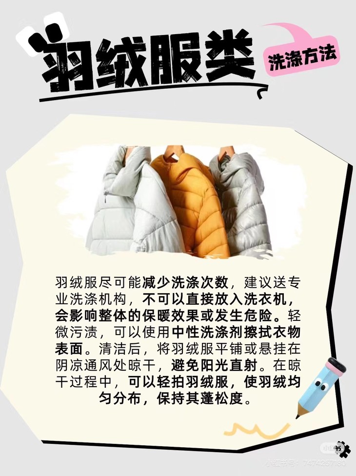 晾干技巧:平铺或悬挂在阴凉通风处晾干,适当拍打羽绒使其恢复蓬松度。