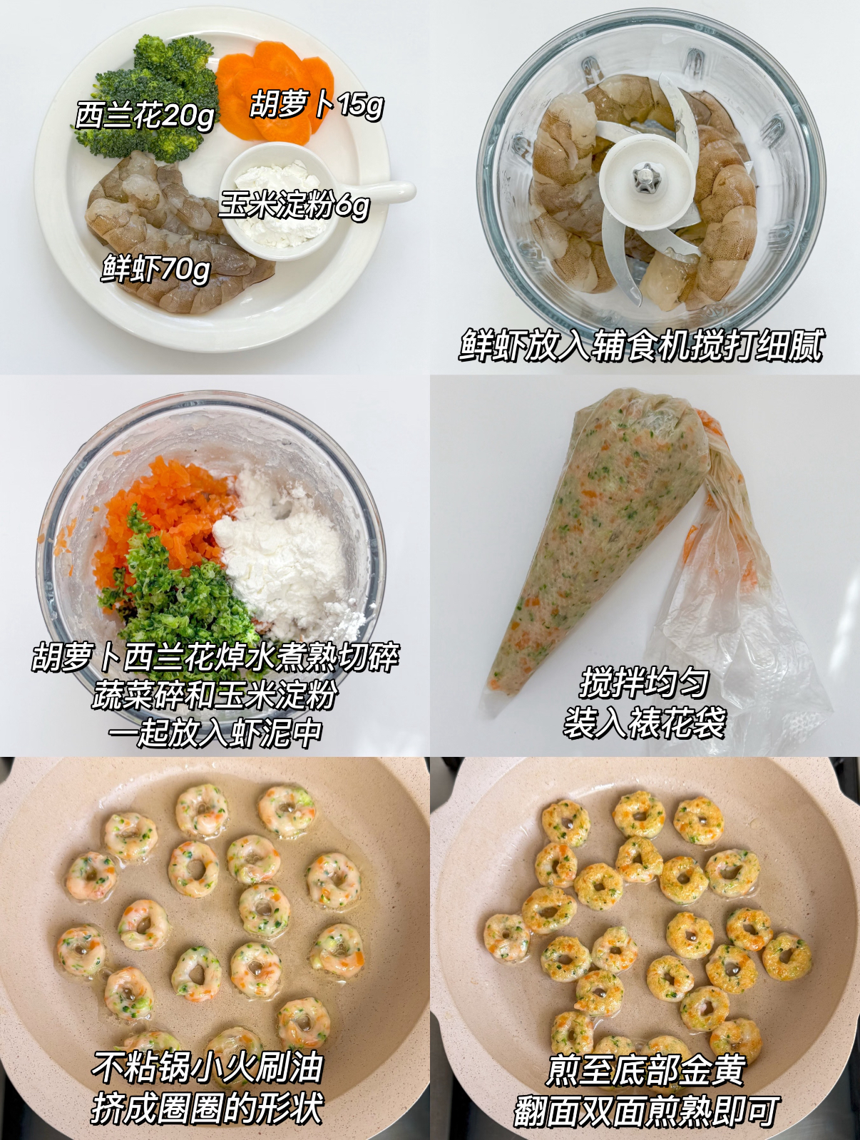 ▪️步骤: 1️⃣鲜虾放入辅食机搅打细腻 2️⃣胡萝卜西兰花焯水煮熟切碎 3️⃣蔬菜碎和玉米淀粉一起放入虾泥中搅拌均匀,装入裱花袋 4️⃣不粘锅小火刷油挤成圈圈的形状,煎至底部金黄翻面,双面煎熟即可