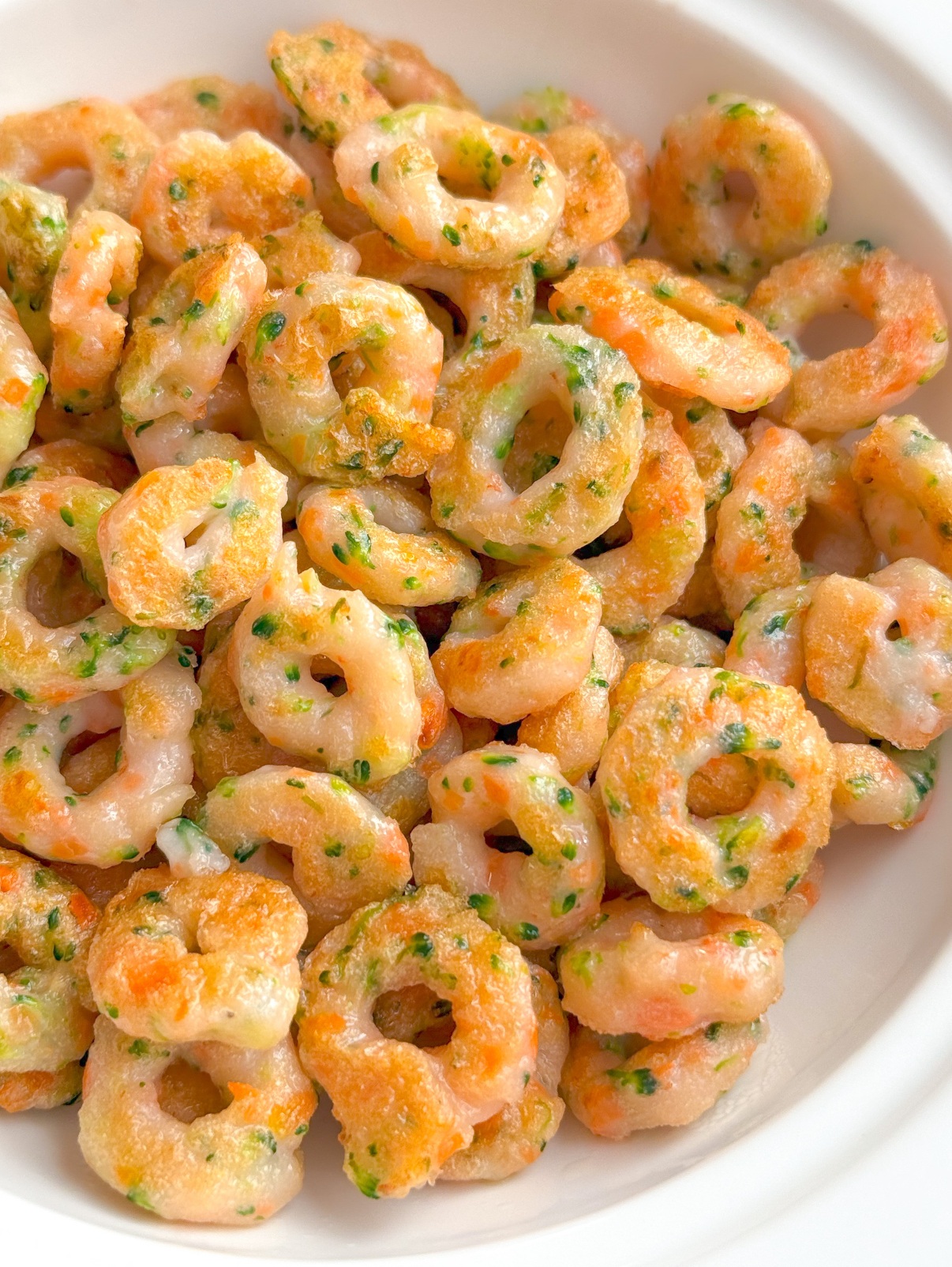 可可爱爱的鲜虾时蔬圈🦐,味道真的超赞👍🏻,满满的虾肉QQ弹弹的。用手抓着吃,还能锻炼宝宝抓握能力。