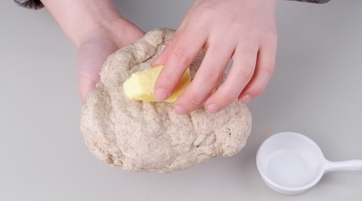 搅拌形成粗膜后,加入黄油,进行最后的搅拌,搅拌至形成较光滑的薄膜