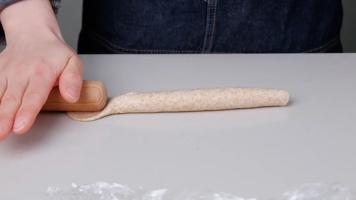 取出松弛后的面团,擀成牛舌状,旋转90度,从上向下卷起,收紧底部