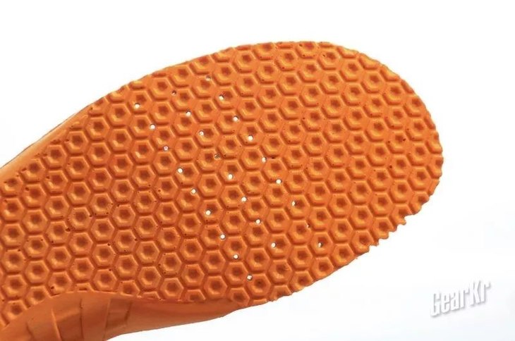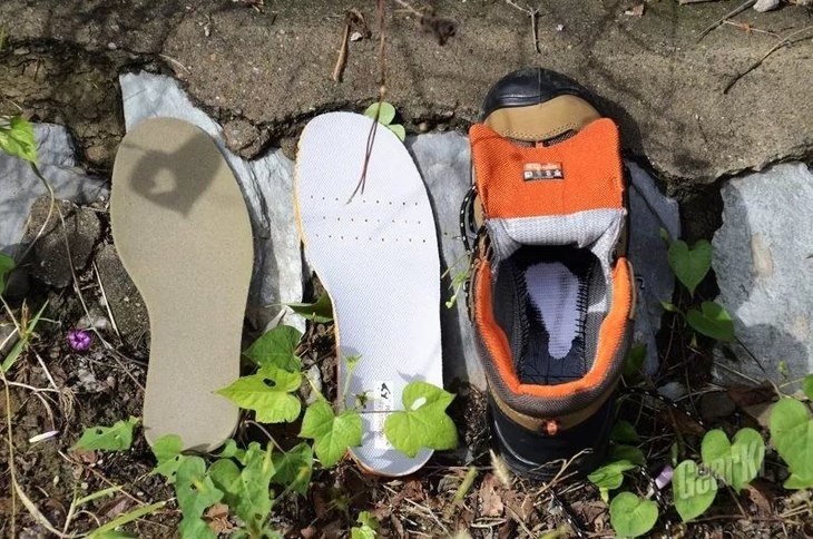 上层鞋垫类似EVA发泡材质,脚掌部位有3行小孔,提高通风透气效果。鞋垫底部呈六边形蜂窝状,这也是比较稳定的结构,避免鞋垫在长途跋涉后的扭曲。