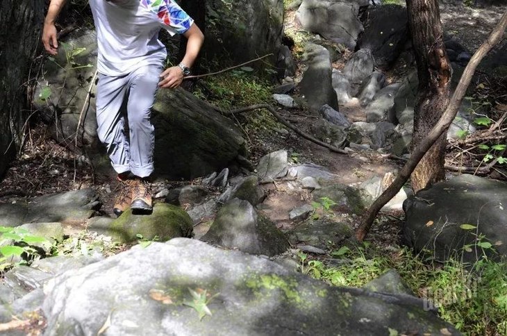 试了一下攀登石壁,没有保护措施,上升也就一米多高。无论是将重心放在脚尖或者外脚背,只要石头不松动,鞋子就会比较稳定,鞋头鞋跟的保护覆盖层,能够保证的脚不被无意碰伤。鞋的表面皮质也不算硬,能够做出较大角度的翻折、蹬踏等动作。