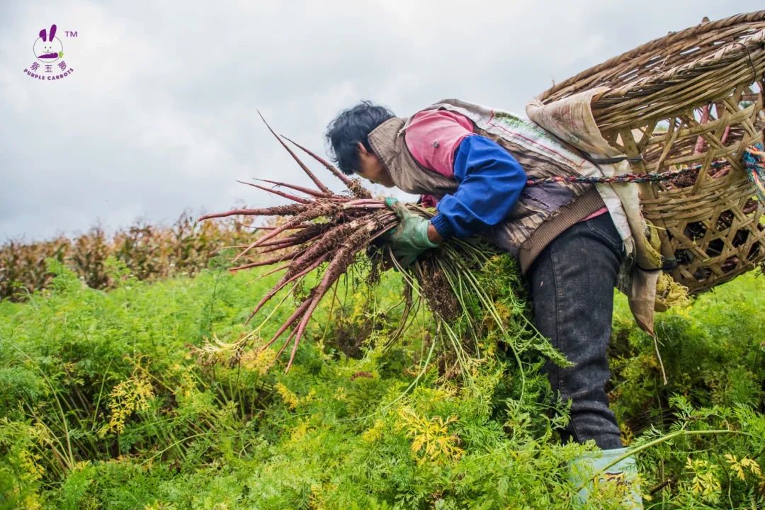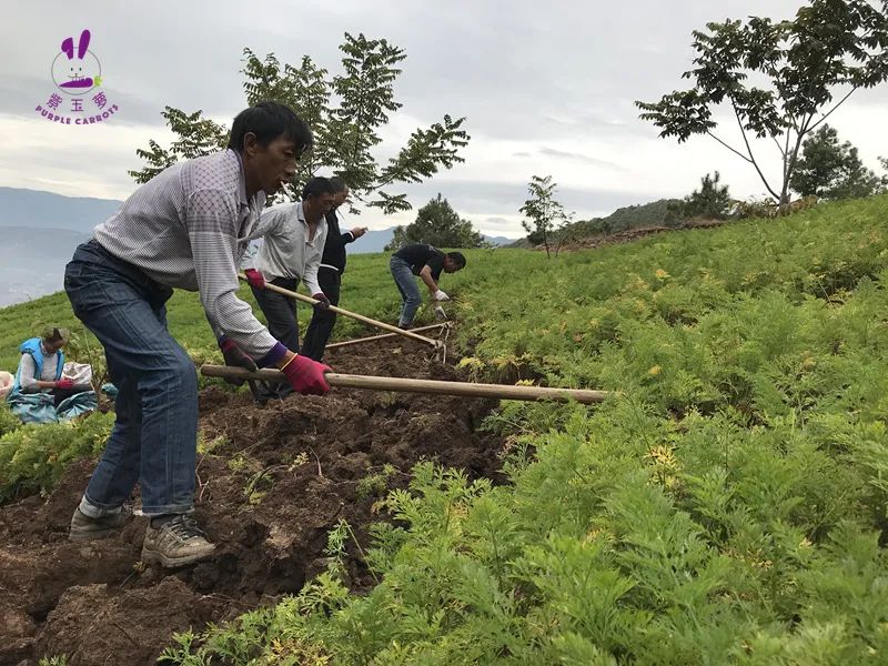 根据不同的种植海拔,农人们爬上35°的山坡,顶着烈日仔细分辨成熟的紫胡萝卜,分时段进行采挖。