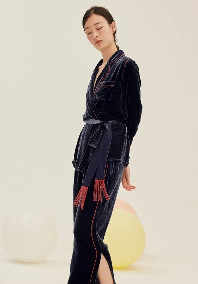 好啦,最后再来说说它的点睛之笔,那就是腰带的撞色流苏设计。这样的设计更符合丝绒本身的贵气感,如中世纪欧洲贵族般,享受奢华的宫廷生活。在走动的过程中,流苏摆动,更带来灵动的美。