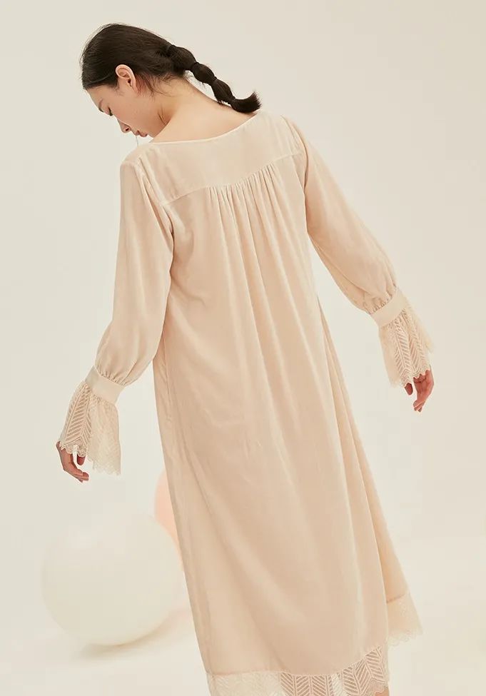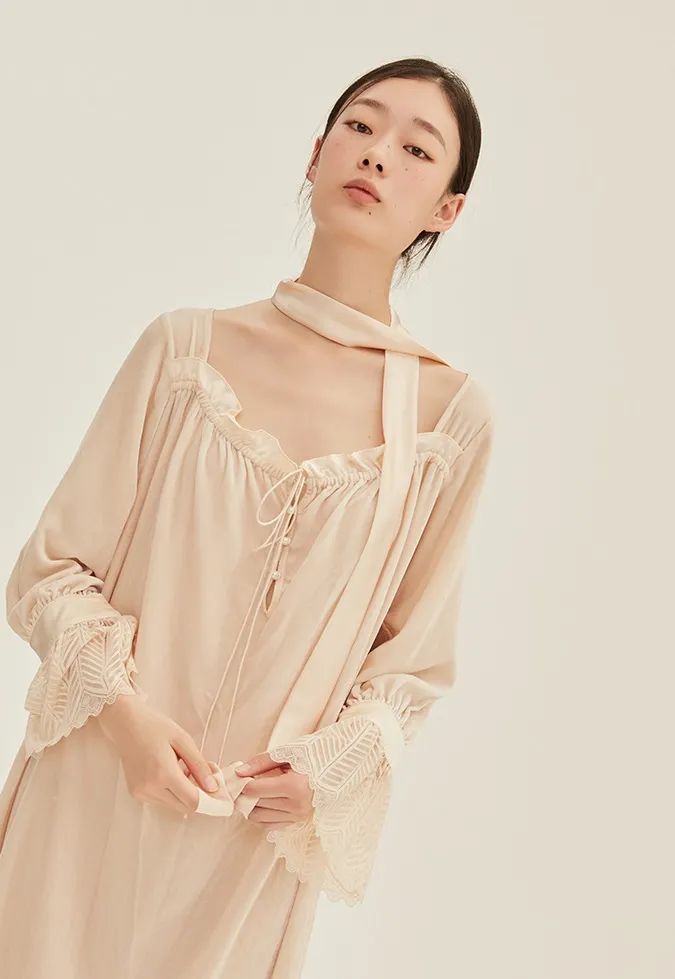 SANGLUO的这件长袖睡裙诠释的就是省心舒适又极尽精致的「简奢风」。它可以运用的场景实在是有点多,而且是轻松到让人上瘾的那种,比如洗完澡随意一套,舒服又保暖。居家工作、休息的生活,它也是非常体贴周全的所在。
