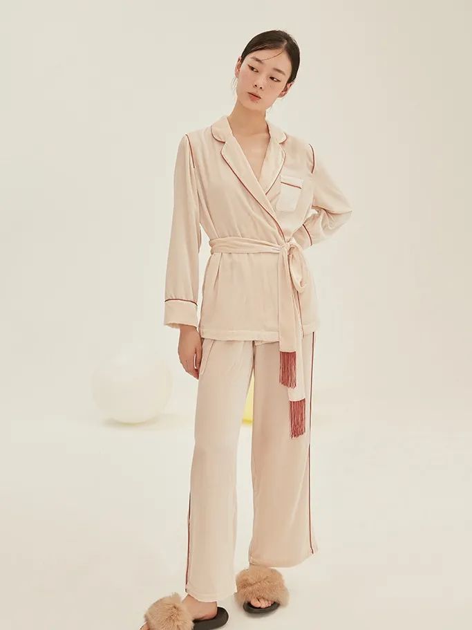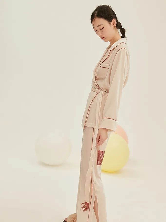 和系扣设计相比较起来,腰带设计更增添了慵懒和随性,适合喜欢无拘无束生活的女性。SANGLUO更推荐无内搭的穿法,肌肤与温柔丝绒亲密接触,精致驳领让颈部看起来更修长。
