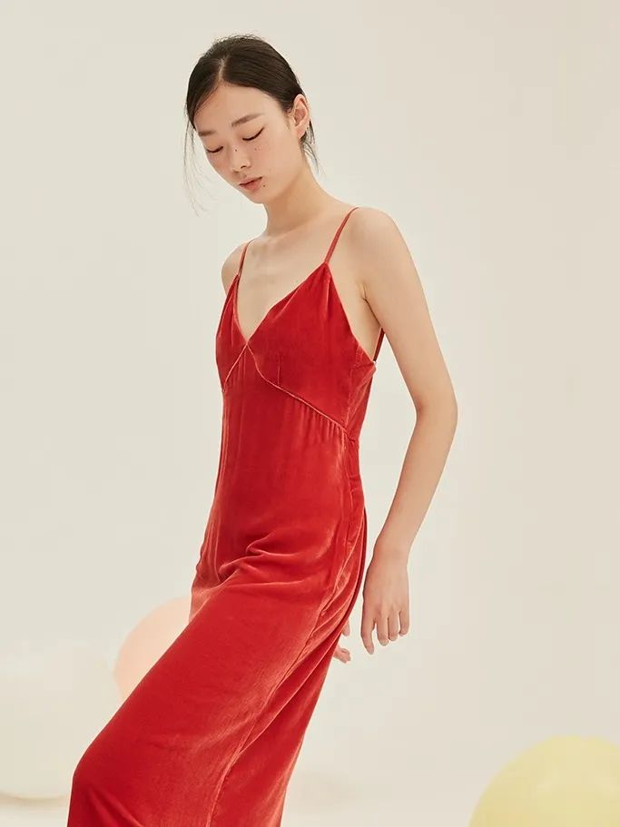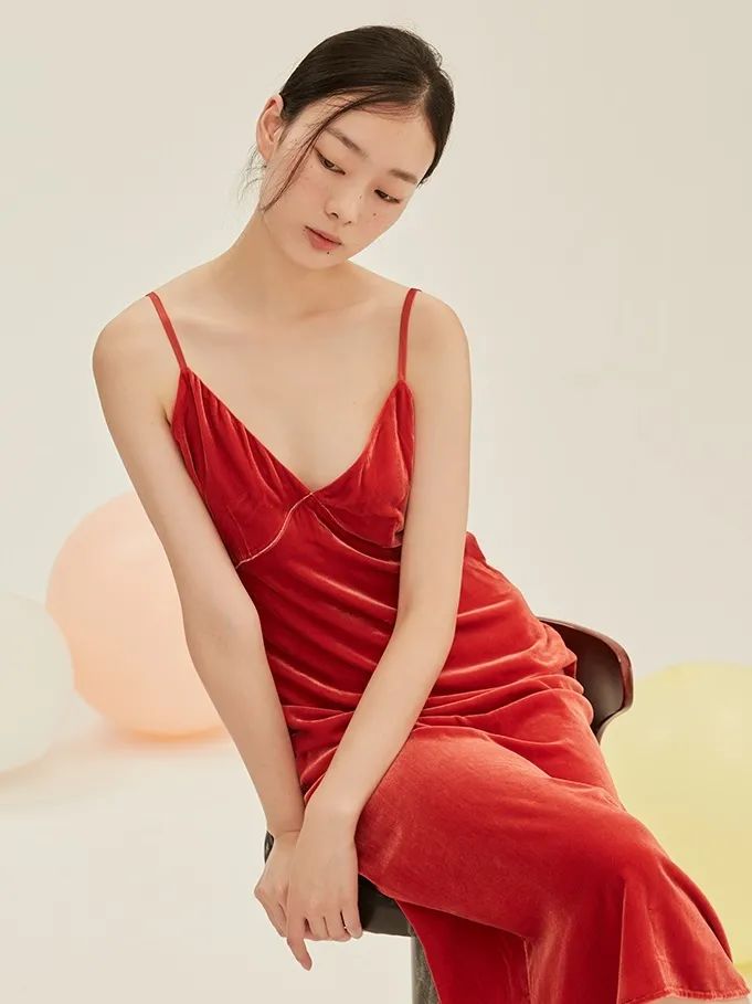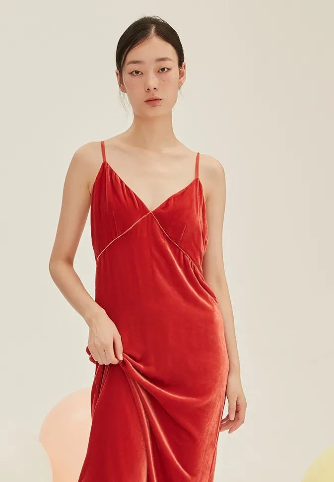 与其说它是一件睡裙,不如说它是一件“战袍”更恰当。真丝丝绒自带高光,修饰身形的曼妙剪裁,让它完全可以胜任年会、轰趴、生日会、婚礼等各种需要“争奇斗艳”的场合。