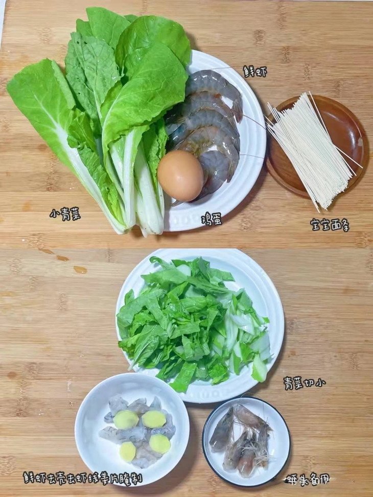 所需食材:小青菜,鲜虾,鸡蛋,宝宝面条,姜片,蒜末。