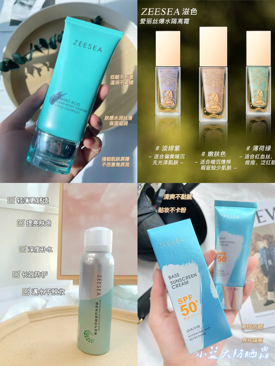 选☀氨基酸洁面乳+防晒霜+爱丽丝爆水隔离+羽缎持妆散粉+隔离防护喷雾