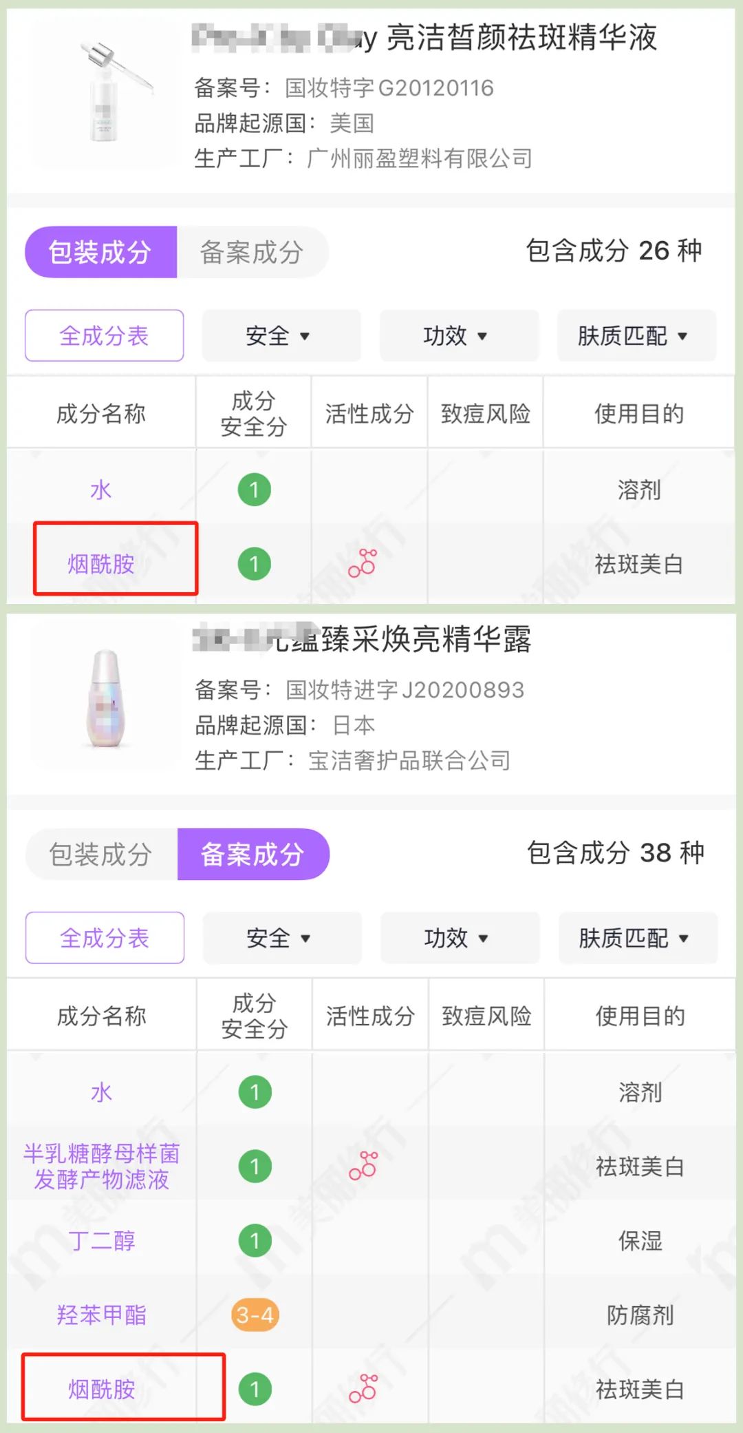 【烟酰胺】大家早有耳闻,像OL*Y小白瓶、SK-I*小灯泡等等知名品牌主要镁白作用成分就是它。
