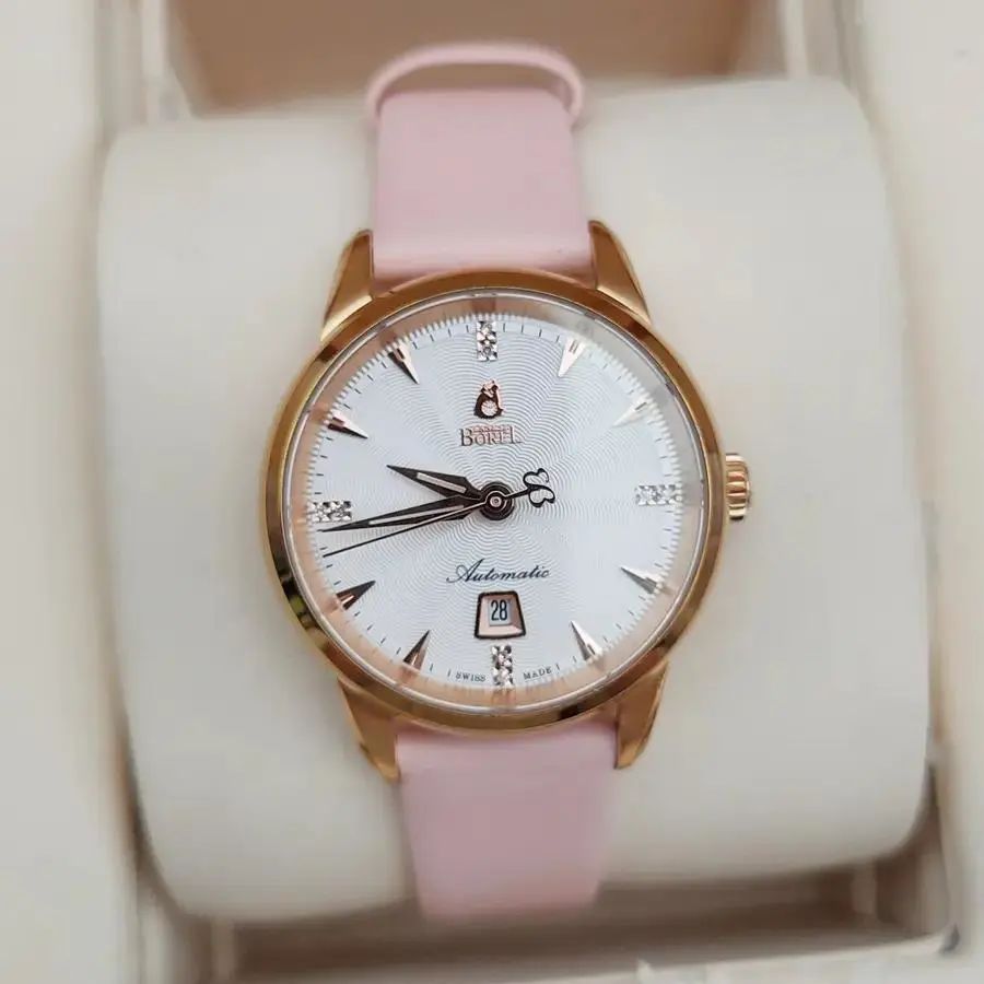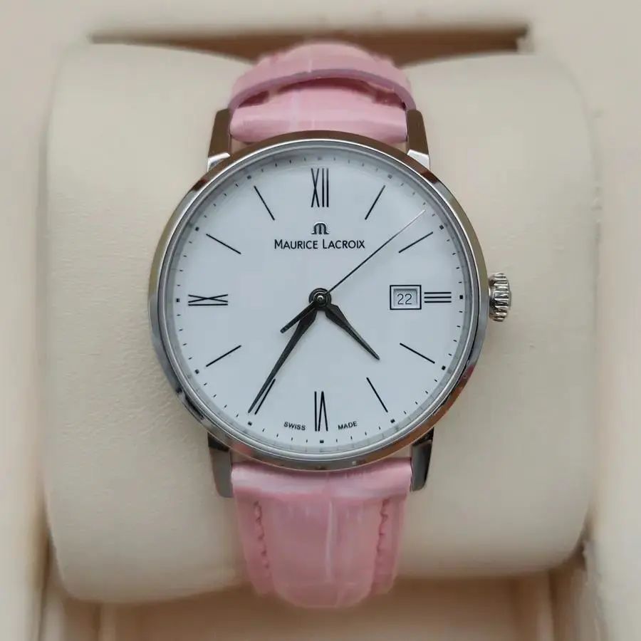 典雅系:33mm表径,白盘皮带镀金表壳,6点钟位置镶钻日历窗。