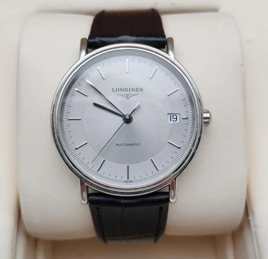 冷酷系:浪琴瑰丽系列L4.721.4中性机械表,34mm表径,精钢表壳皮带,灰色表盘条形刻度,日期显示,单表9成新。