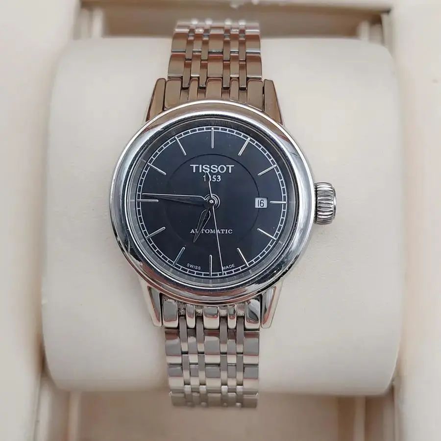 冷静系:天梭经典系列T085.207.11.051.00女款机械腕表,30mm表径,黑盘钢带,精钢材质表壳,条形刻度,日期显示,单表9成新。