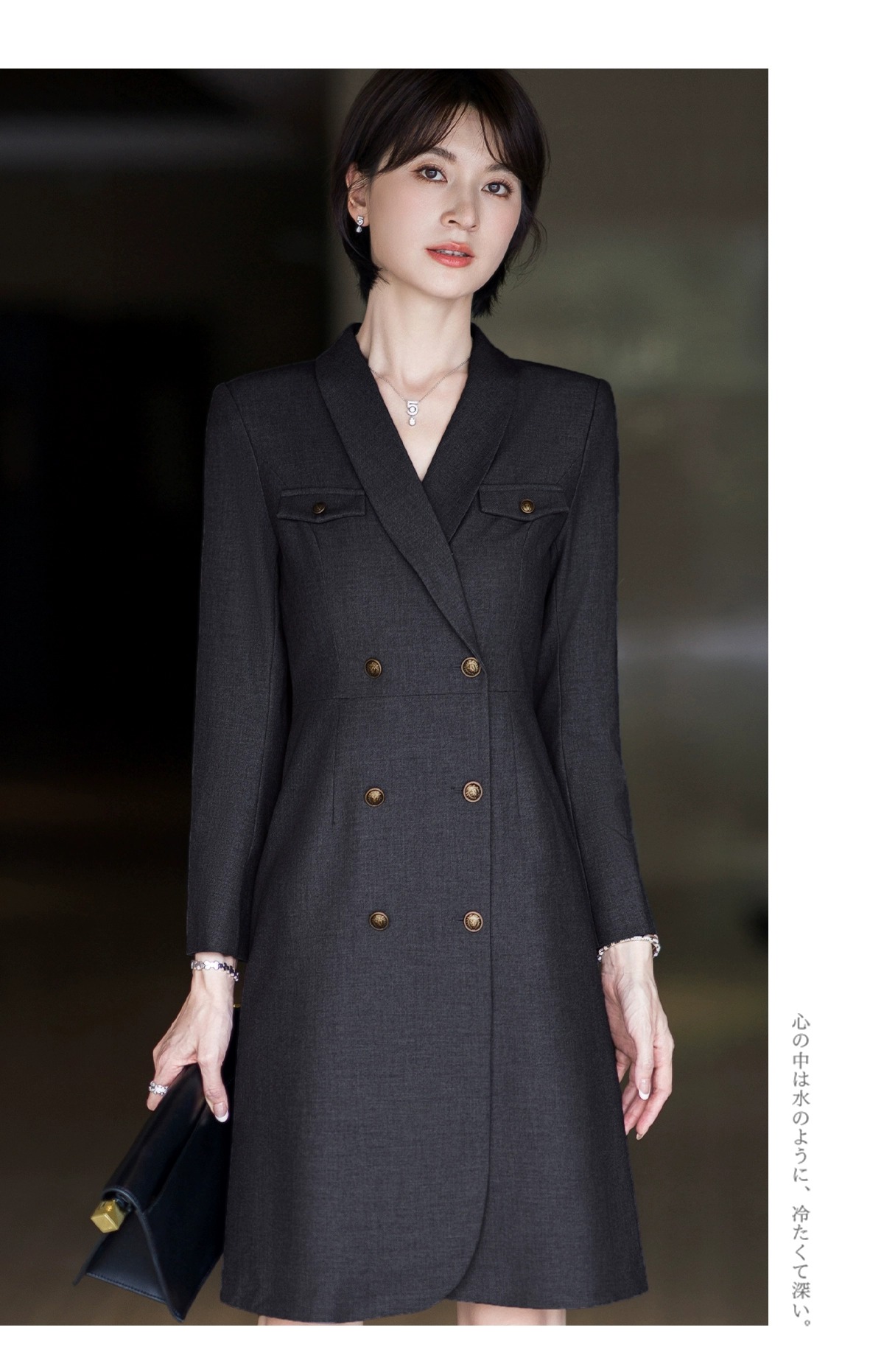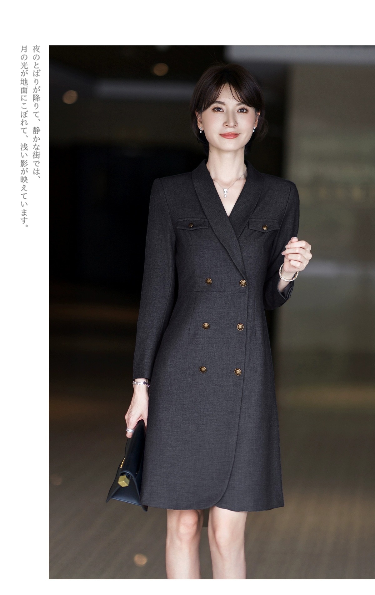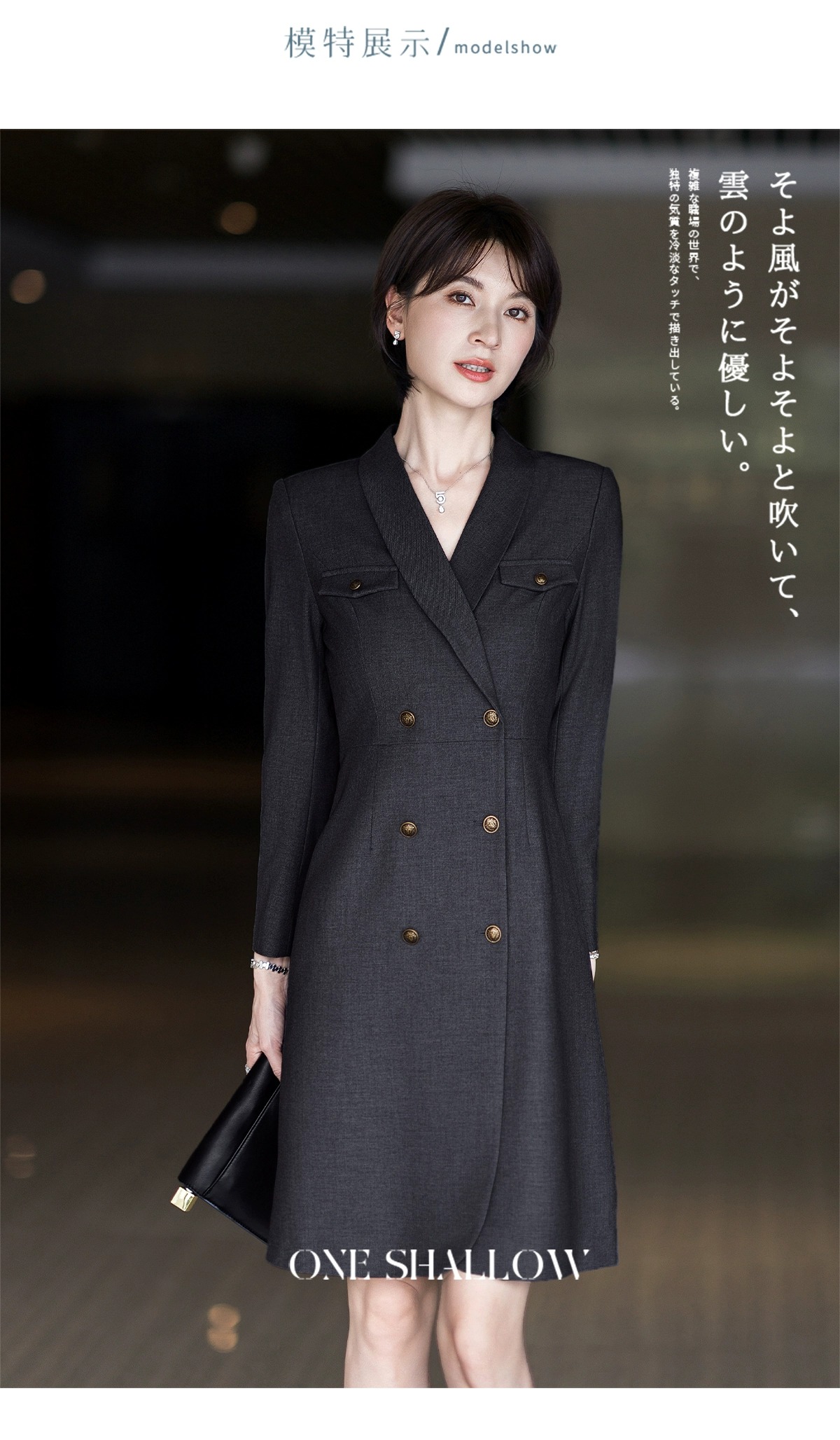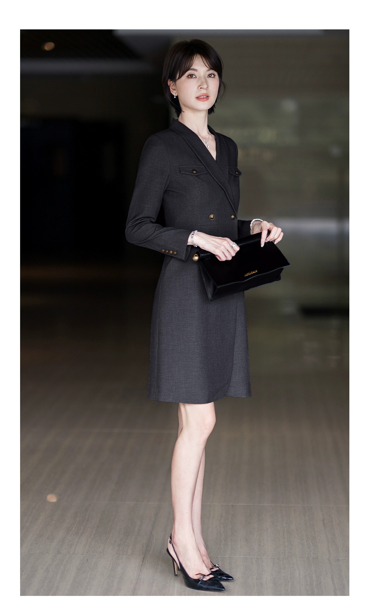 当职场穿搭需要在“专业感”与“高级感”间找到完美平衡,这件灰色青果领双排扣羊毛西装连衣裙给出了标准答案