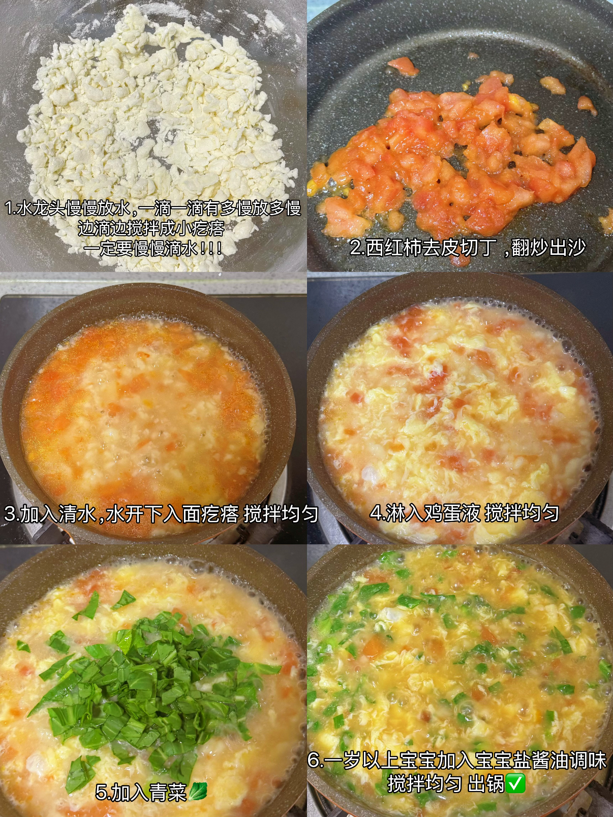 面粉中要少量多次的加水,边倒水边搅拌,这样出来的面疙瘩才会细小,锅中可以多倒点水,水太少容易糊锅。一岁以上宝宝可适当加点盐和酱油调味。