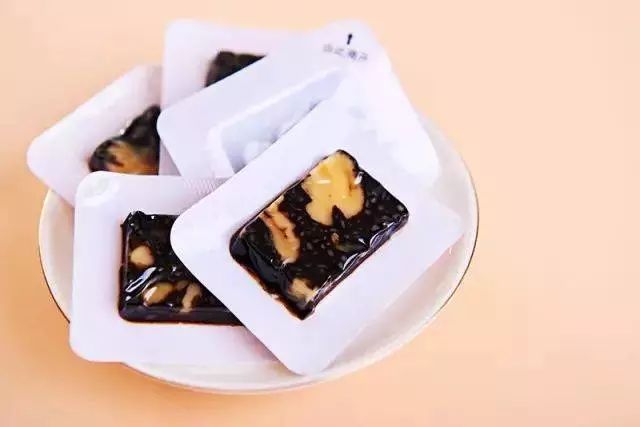 再搭配优质山核桃、黑芝麻、正宗绍兴黄酒。一撕开外包装,饱满的核桃仁、芝麻,镶嵌在阿胶中,看得见的真材实料。入口酥软不黏腻,比传统阿胶块更好咀嚼,口感更Q弹。