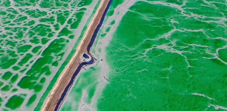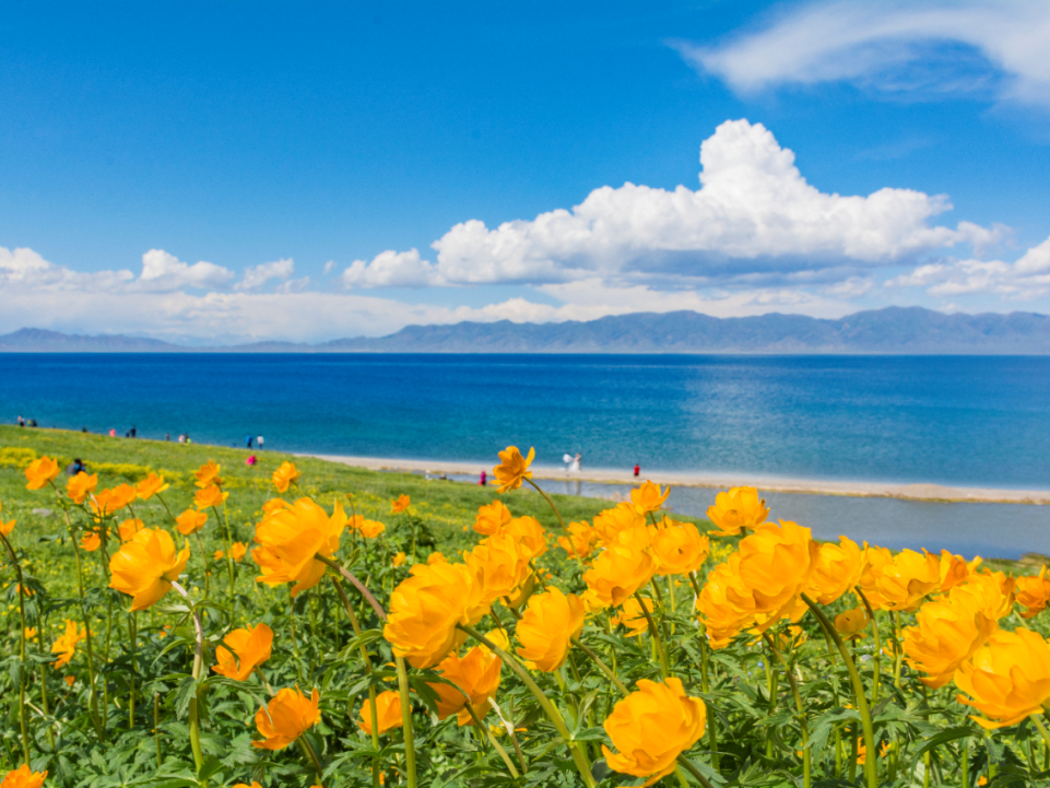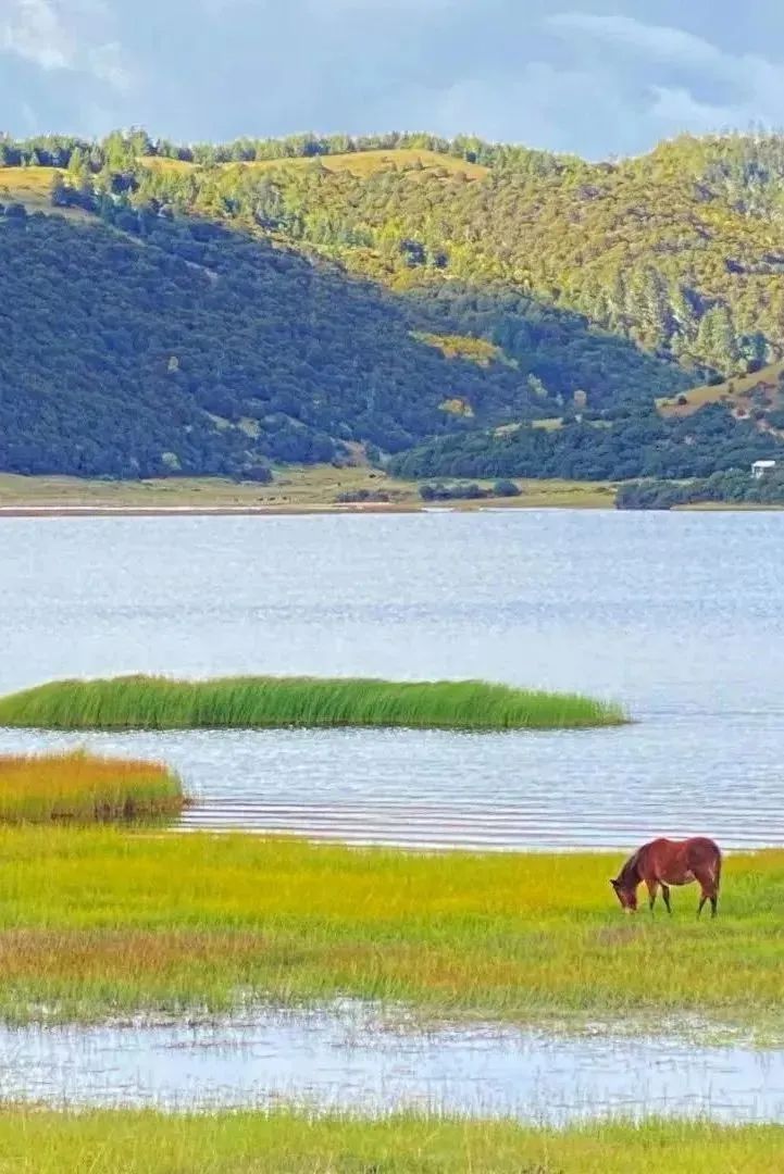 辽阔深蓝的湖水显现在蓝天与草原之间