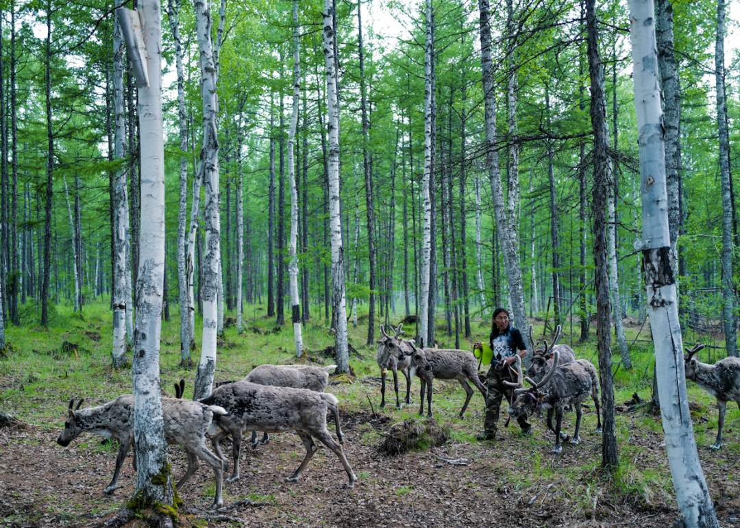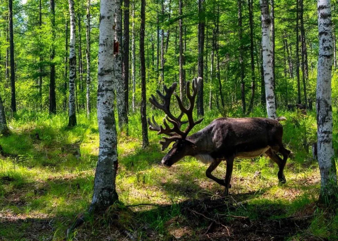 在高纬度的原始森林里与驯鹿嬉戏玩闹