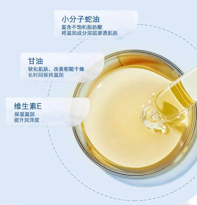像蛇油、甘油、维生素E全都是保湿修复皮肤的法宝,既深层缓解皮肤干燥缺水,又修复皮肤屏障。