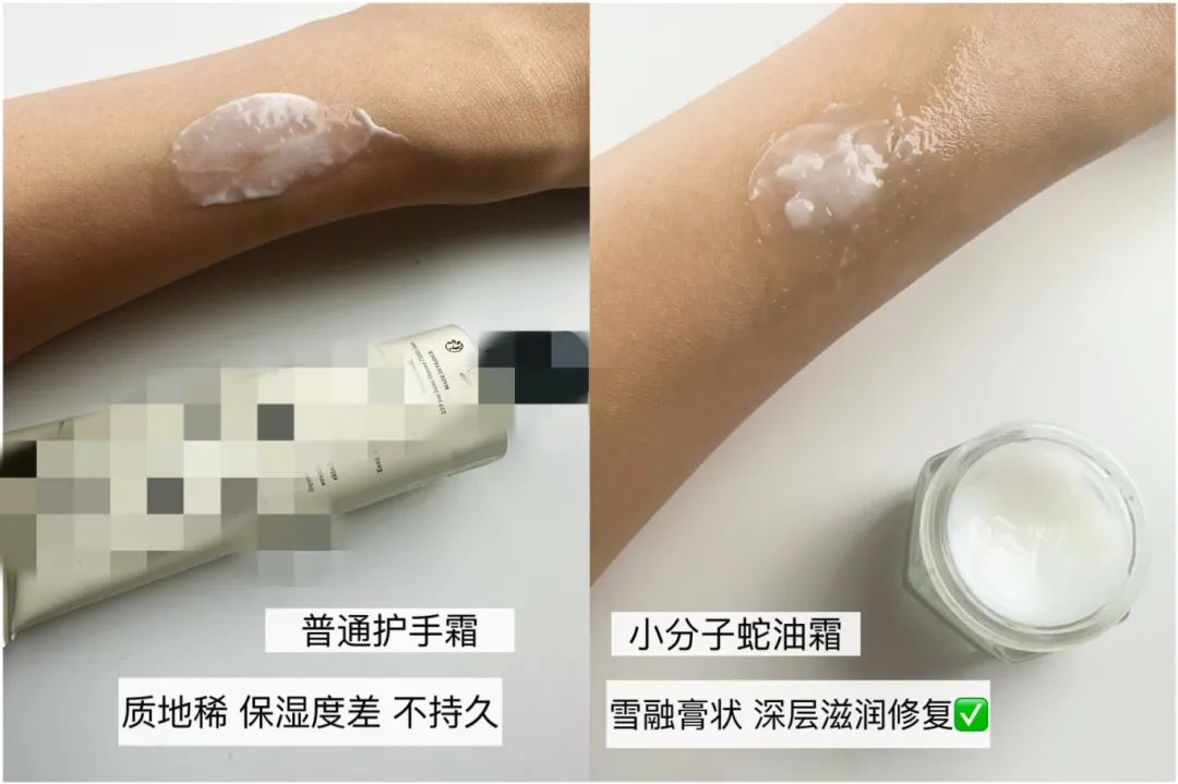 小分子蛇油被做成雪融状,滋润保湿度更升一个level,持久保湿比普通护手霜强多了!
