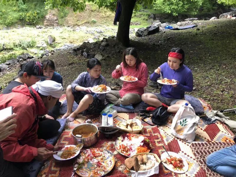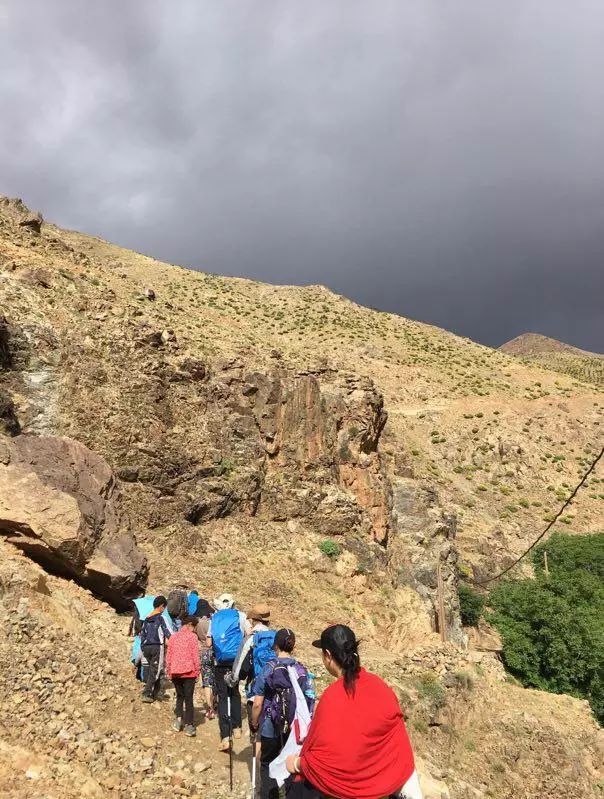 之前在这里徒步是从来不会下雨,所以我们也没有做好防雨的准备,不料山区降雨说来就来,我们的向导催促我们赶快走,但还是和雨亲密接触。雨越下越大,将近 2 个小时的降雨我们都是在雨中行进,我们只能不停的走,防止自己在雨中失温。浇灌了两个小时雨水之后,雨终于停了,每个人都成了落汤鸡,湿透的衣服紧紧贴在身上加上山区的风,透心的凉,幸好同行的队员们互相帮助,领队蓝梦拿来一位男队员备用的干衣服让我穿,虽然还是冷,但比湿衣服好得多。中午我们在山区野餐,有专门的当地人为我们做饭,是最简单的摩洛哥餐,每个人都感受到了寒冷之后的一顿热饭,倍感温暖。