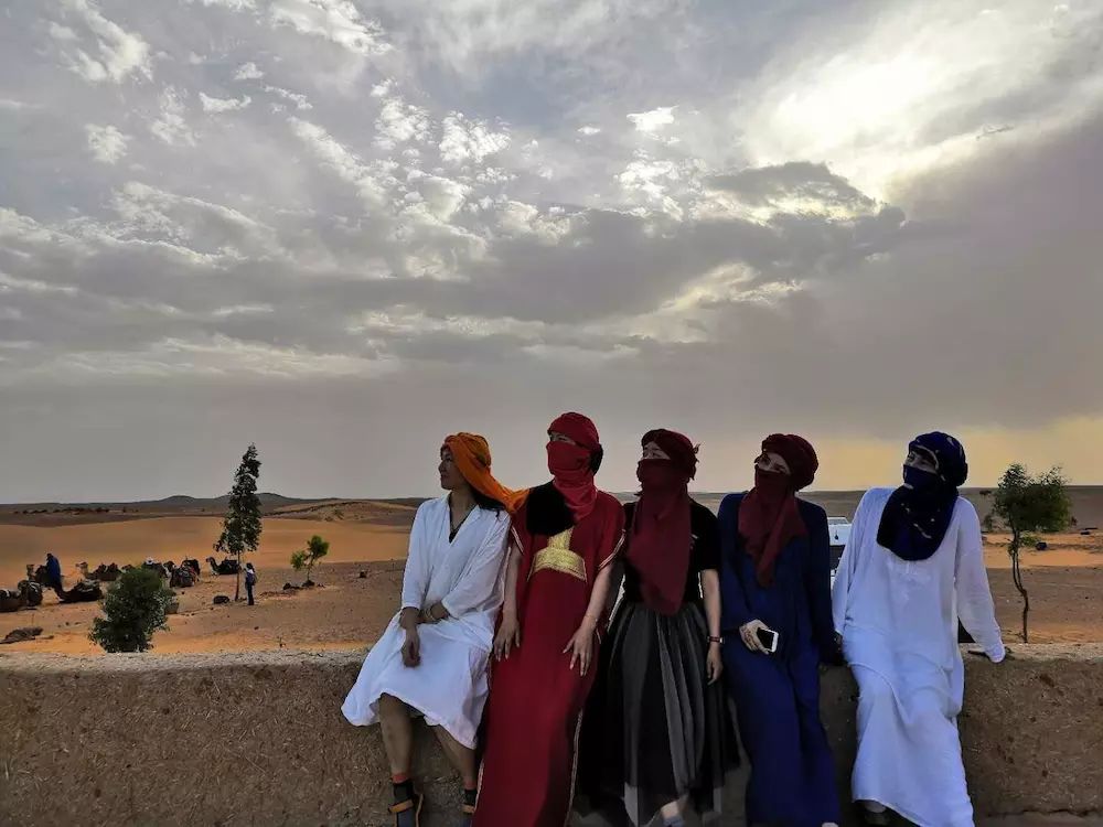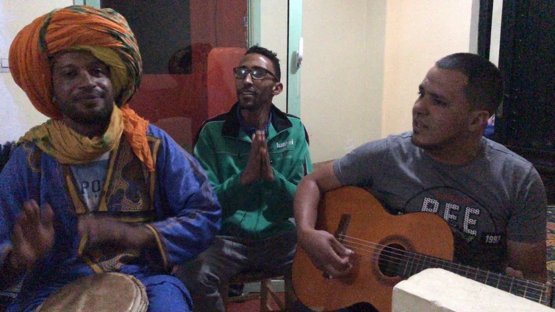 晚餐过后,非洲小哥突然在门口探出他的小脑袋,调皮的他准备和我们一起在晚上开 party 。他的出现给我们带来了无限的欢乐,多才多艺的小哥不仅会法语,西班牙语,英语和当地的柏柏尔语,还会唱歌,他用吉他和非洲手鼓给我们唱歌,把我们的思绪带到了非洲腹地,感受非洲人们一起唱歌跳舞的情景,此时此刻每个人都融入了一个国度的文化中,那种感受是实实在在而且真切的,非常具有感染力,我们一起度过了难忘的一晚。