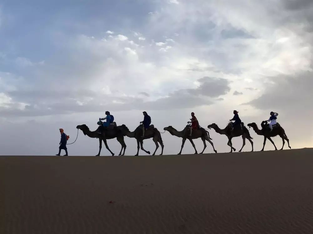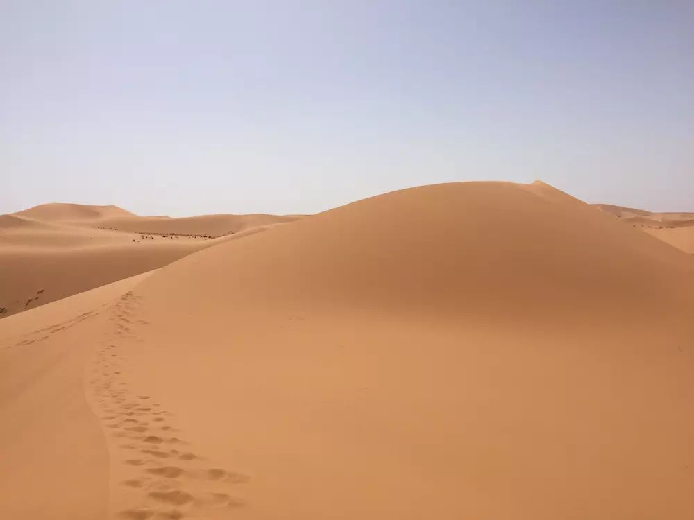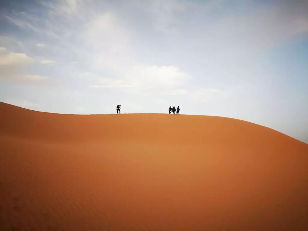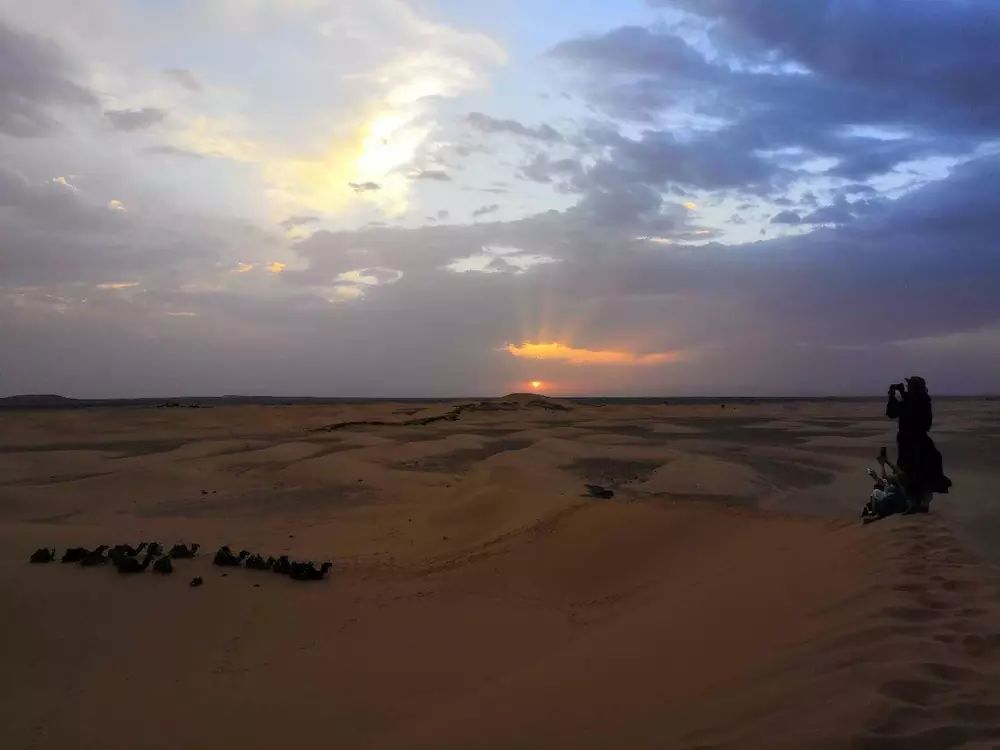 驼队三队,每队 5 匹骆驼,借着落日的夕阳,缓慢行进到准备看落日的沙丘,坐在摇摇晃晃的骆驼身上,这沙漠中特有的奇特生物,总是高傲的抬起头,面对酷暑和干旱,从不畏惧。我们一起爬上沙丘顶部,等待日落,在这里看到壮美的景色,真的有队员在这里落泪。撒哈拉的眼泪。