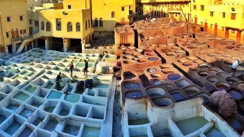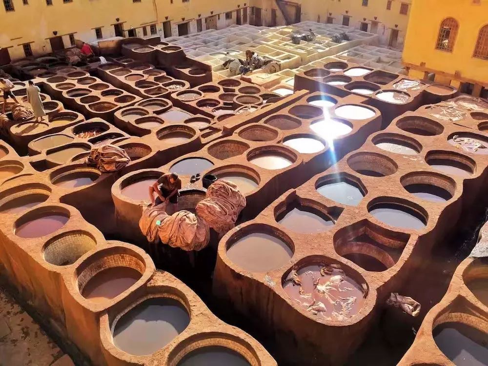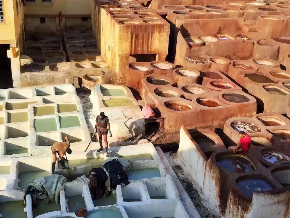 看着染匠们站在五颜六色的染缸里,将一块块完整的牛羊皮革放进去,再将已浸泡好的皮革拎出来,劳作的工人完全赤脚站在染缸中,在摩洛哥灼热的阳光下辛苦工作,忍受着染缸散发着的刺鼻气味。我怀疑这种传统技术是否有大规模存在的必要,毕竟现代印染技术已经很发达了。这些染缸还继续存在的理由只能是文化遗产的传承,游客需要亲身感受这种工艺,才能真切体会现代之前,纯手工时代那种辛苦和原始。