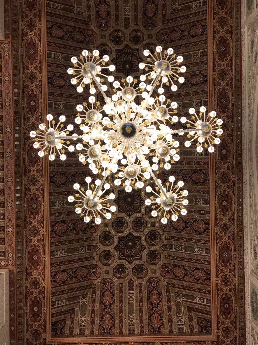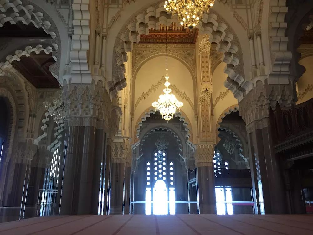 这边的人主要的语言是阿拉伯语和法语,英语用到的地方很少,我们的交流主要是肢体语言和领队的法语。买票之后进入到清真寺内部,这里可容纳几万人在这里做礼拜,进入是要脱鞋脱袜,由于我们进去的时候已经是下午 3 点,礼拜的仪式已经结束了。但寺庙里宏伟的建筑风格和华丽的内部装饰还是震惊到了我。