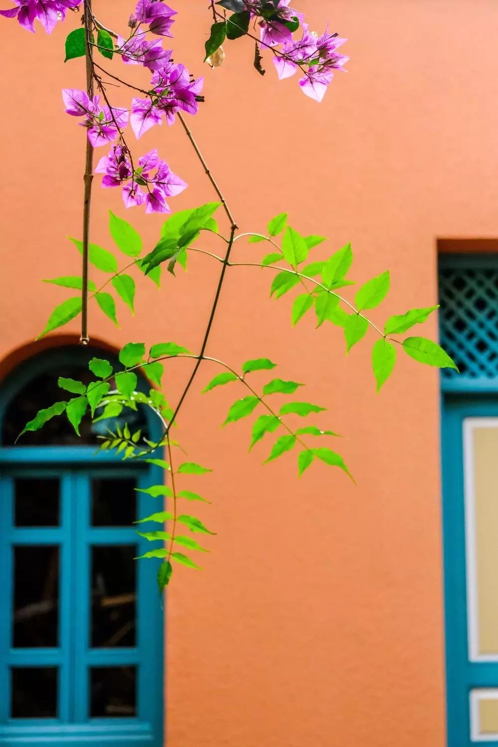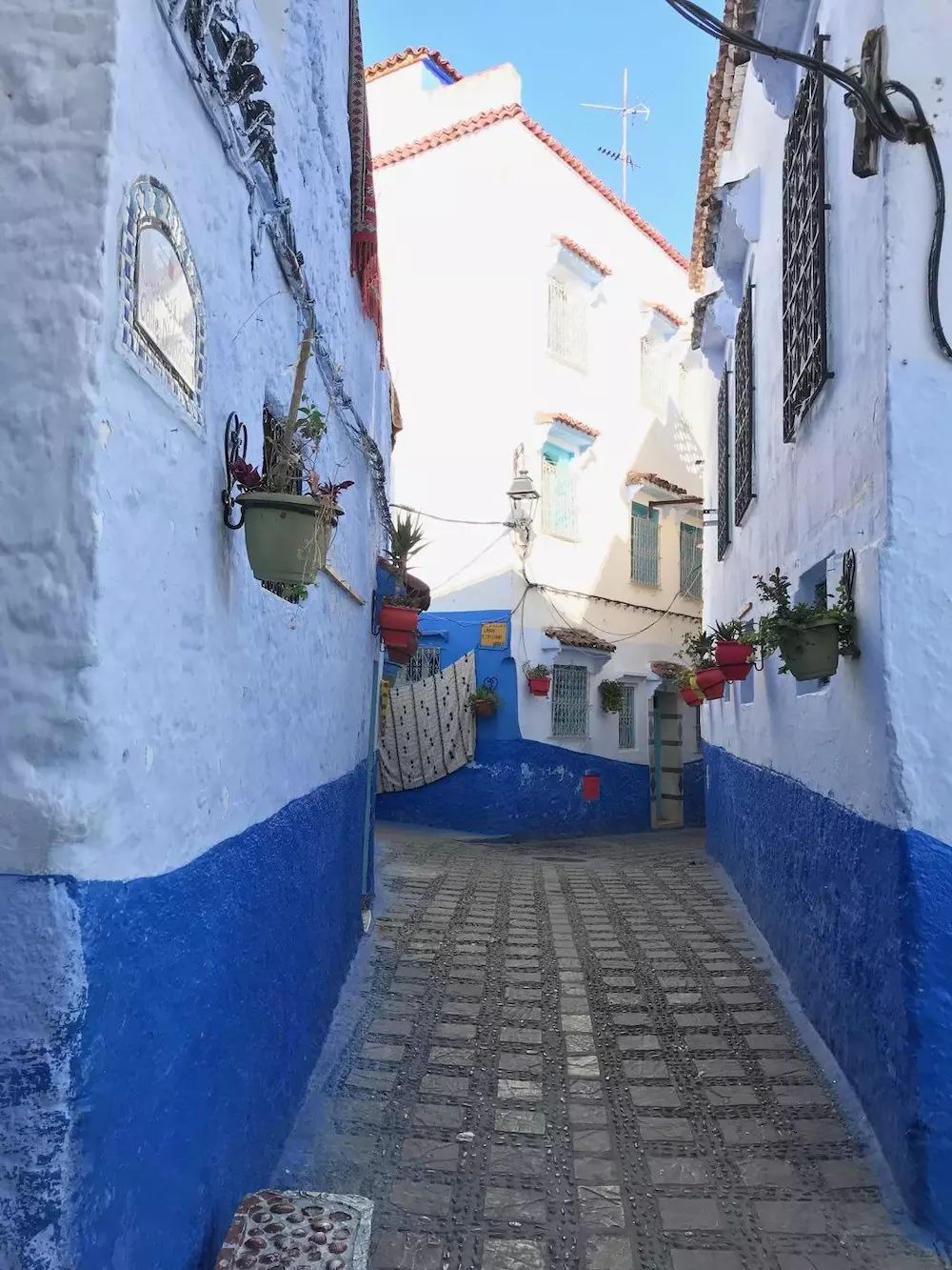 这座小城房屋和大街小巷涂成深深浅浅各种蓝色,每一步都是一幅画,街道中错落有致的红色黄色花盆,装店的这座城市像画一样美丽。