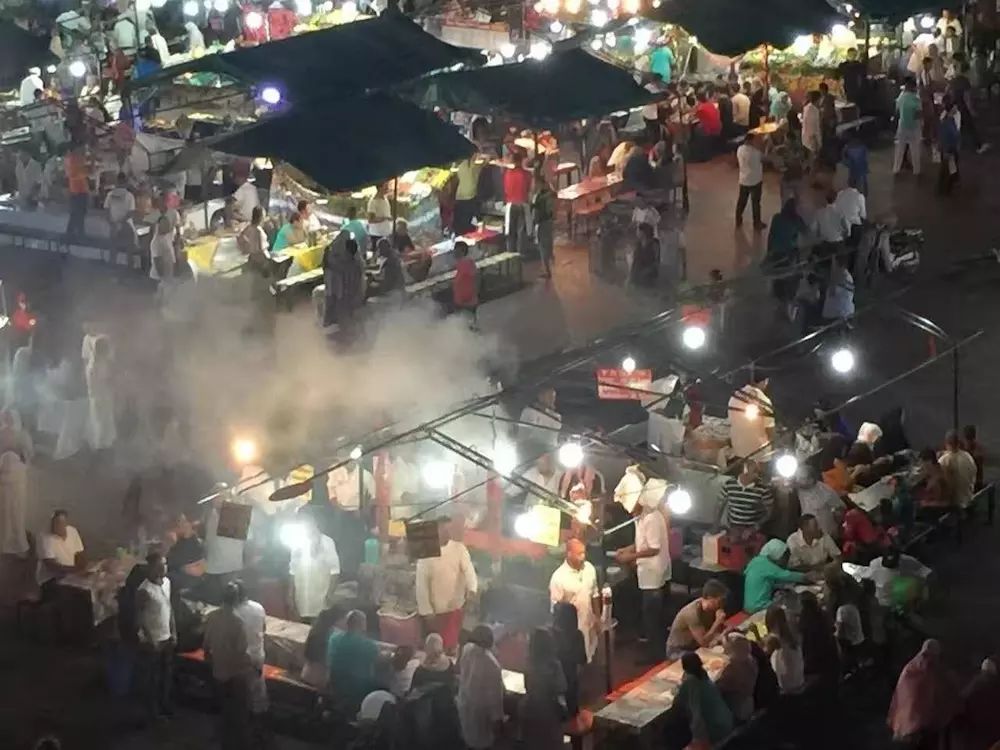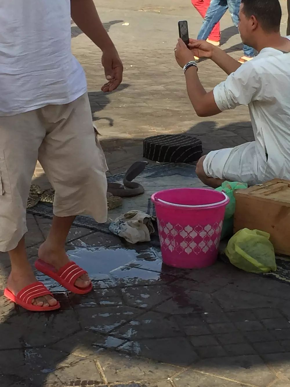 作为游客我们每天都有行程安排,无法体会一天禁食的感觉,但当地人白天选择不工作,休息的方式度过这一天,晚上太阳落山之后,广场就热闹非凡。广场上有各种商人,手艺人,卖艺的人。这里可以看到各种摩洛哥热带水果,当地手工艺,饰品,服饰和街边小吃。最让我难忘的是耍蛇人,在这里我见到了真正的眼镜蛇!眼镜王蛇!中间那条蛇是眼镜蛇