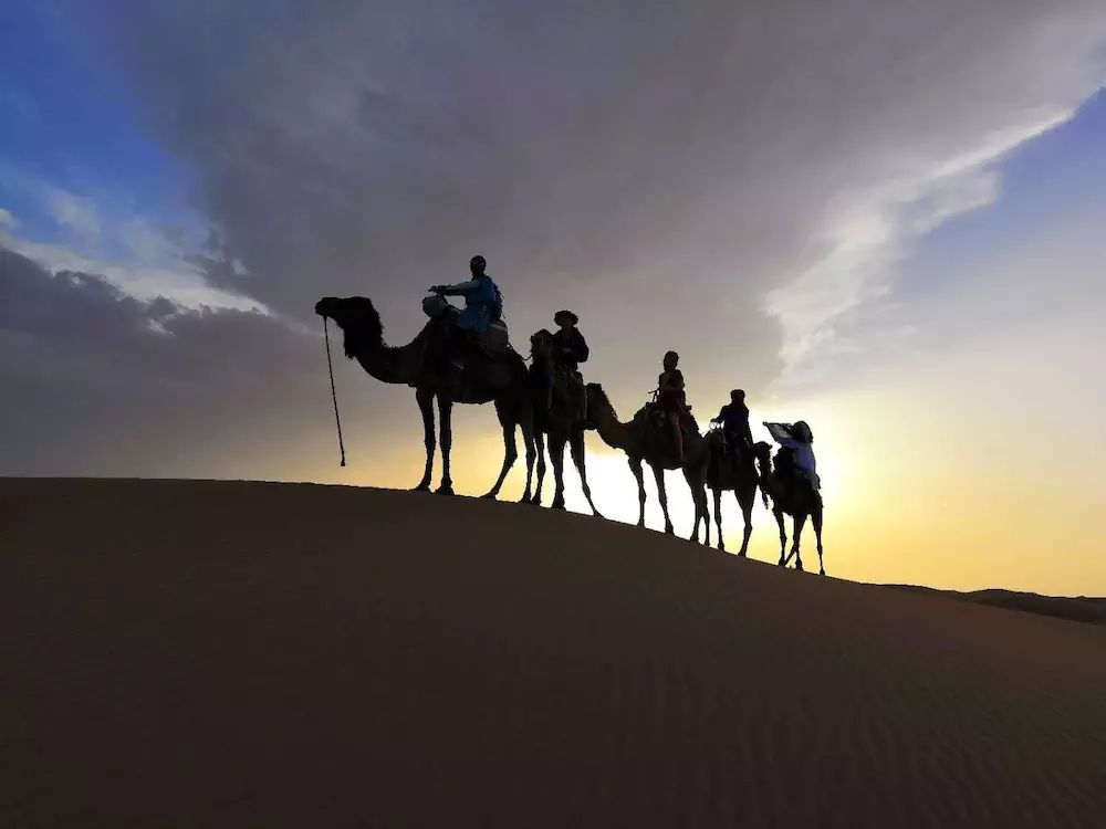 下午我们骑骆驼徒步沙漠。坐在骆驼背上,看云层中的太阳,在沙丘上看最美的沙漠日落,第一次骑骆驼,脑补骆驼商队经过沙漠的情景。
