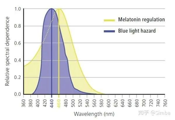 有益 (黄色部分) 和有害 (蓝色部分) 的蓝光谱段。