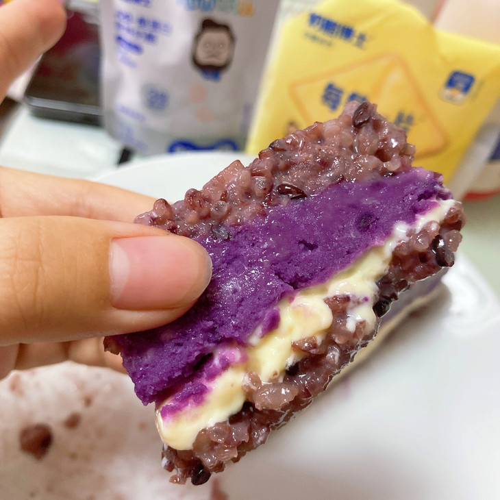 最后用长方形模具,分别装入紫米、芋泥、奶酪和紫米,做出奶砖的层次感!