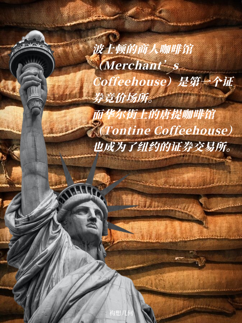 跟母国英国一样,美国的咖啡都不好喝,可是生意却做得很大。波士顿的商人咖啡馆(Merchant’s Coffeehouse)是第一个证券竞价场所,而华尔街上的唐提咖啡馆(Tontine Coffeehouse)也成为了纽约的证券交易所。