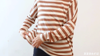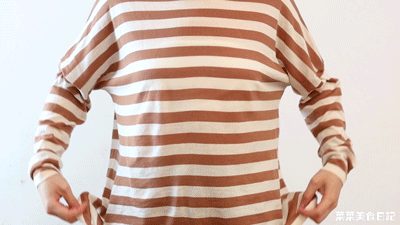 将下摆对折3~4圈,再多次旋转两侧衣角,塞进衣服里面可以啦(根据能接受的高度调节圈次哈)