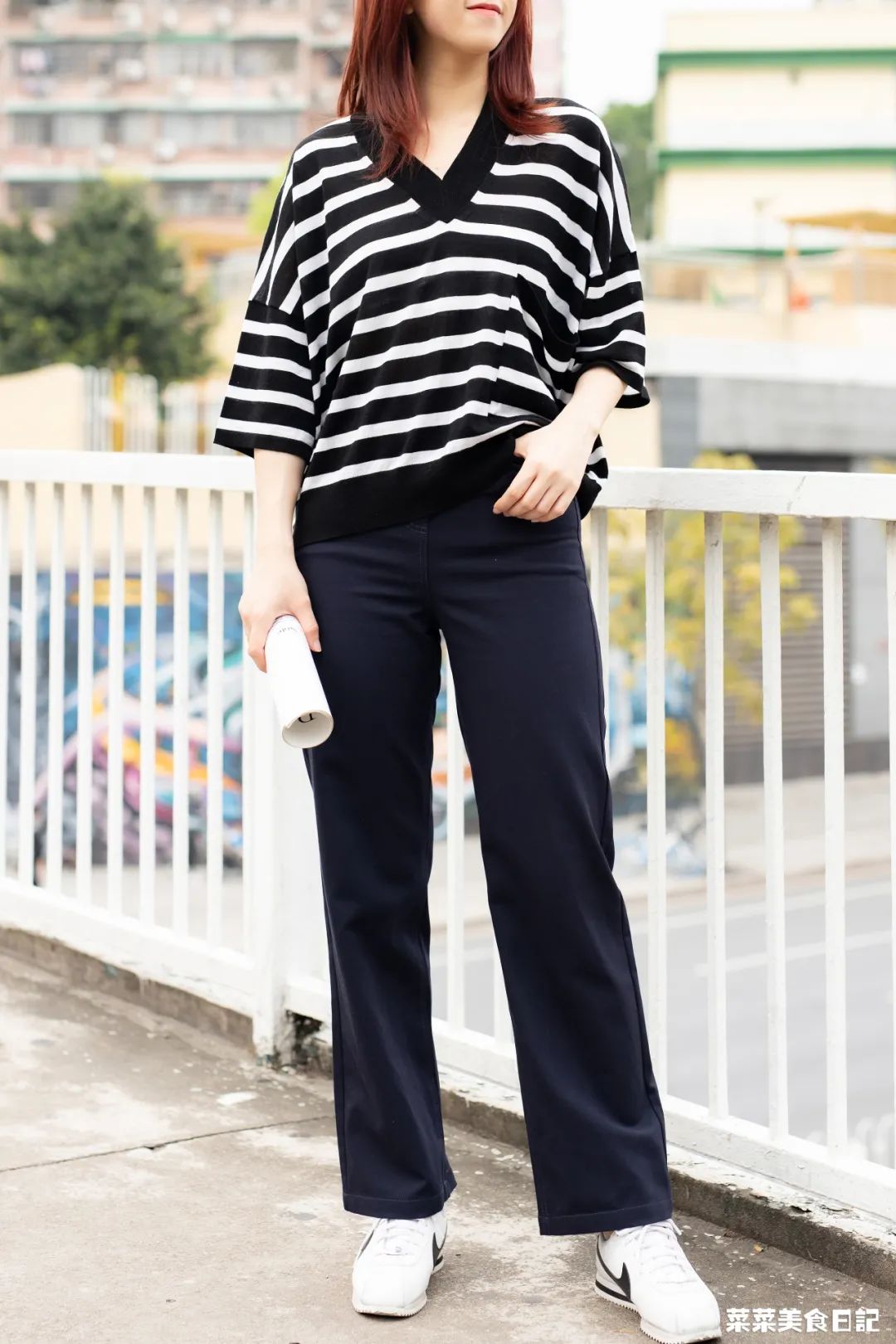虽然轻薄,但针织衫的垂悬感挺强的,上身轻盈不臃肿。
