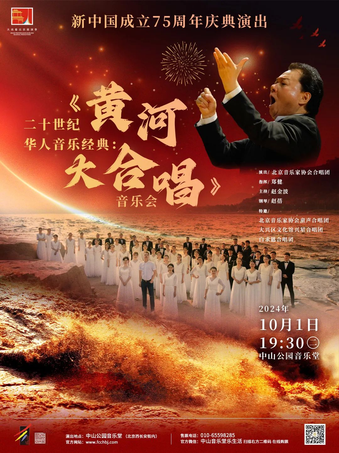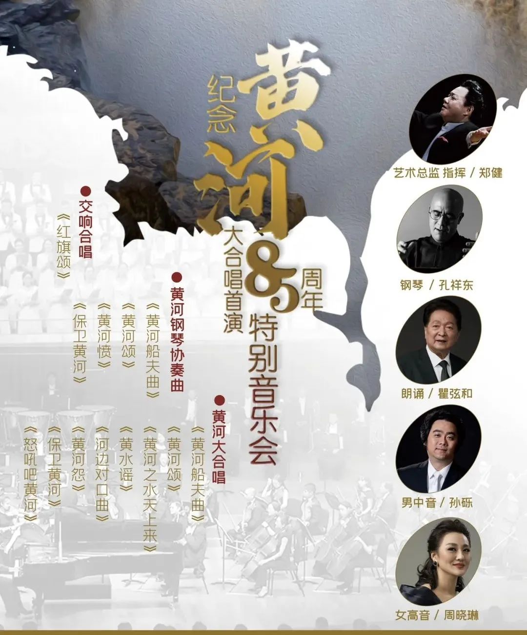 为纪念《黄河大合唱》首演 85 周年,指挥家郑健中国广播电影交响乐团、中国广播合唱团及多名艺术家将共同演绎中国经典音乐作品——交响合唱《红旗颂》、声乐套曲《黄河大合唱》及钢琴协奏曲《黄河》。3场音乐会信息如下: