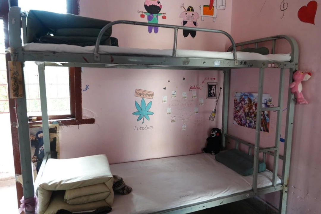 走进学生宿舍发现,房间一尘不染,被子呈豆腐型,墙上布满各种手绘图案。