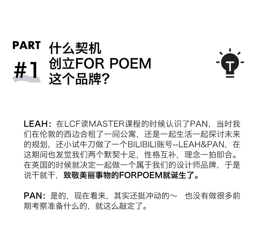 POEM不仅有诗句的意思,她还有“美好事物”的含义,FOR POEM即是致美物-致敬美丽的事或事物.